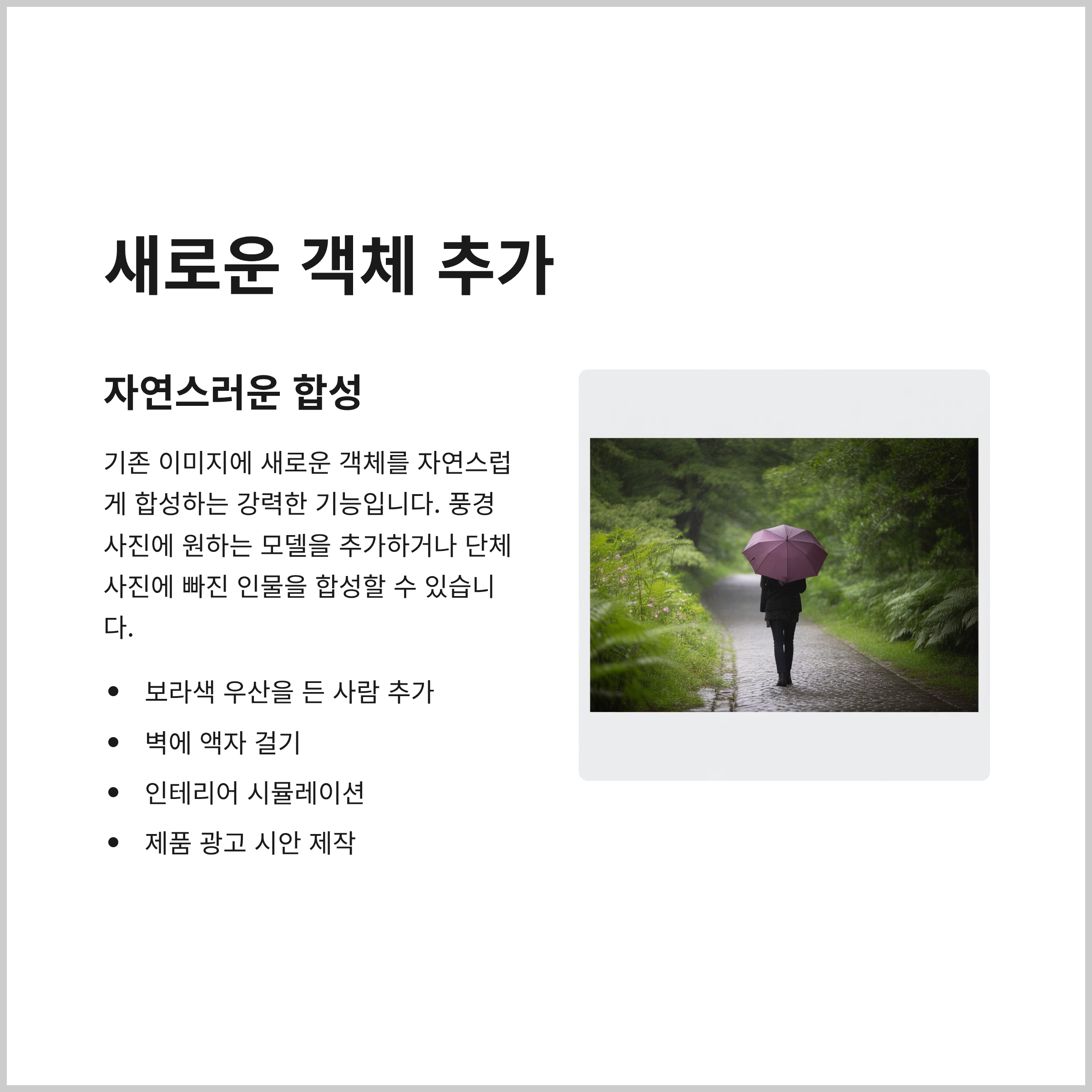 예를 들어, 빈 공간에 "보라색 우산을 든 사람을 추가해줘"라고 입력하면 주변 환경과 조화를 이루는 이미지가 생성된답니다. 또한, "벽에 액자를 걸어줘"처럼 사물을 추가할 수도 있어서 인테리어 시뮬레이션이나 제품 광고 시안을 만들 때 매우 유용하죠.