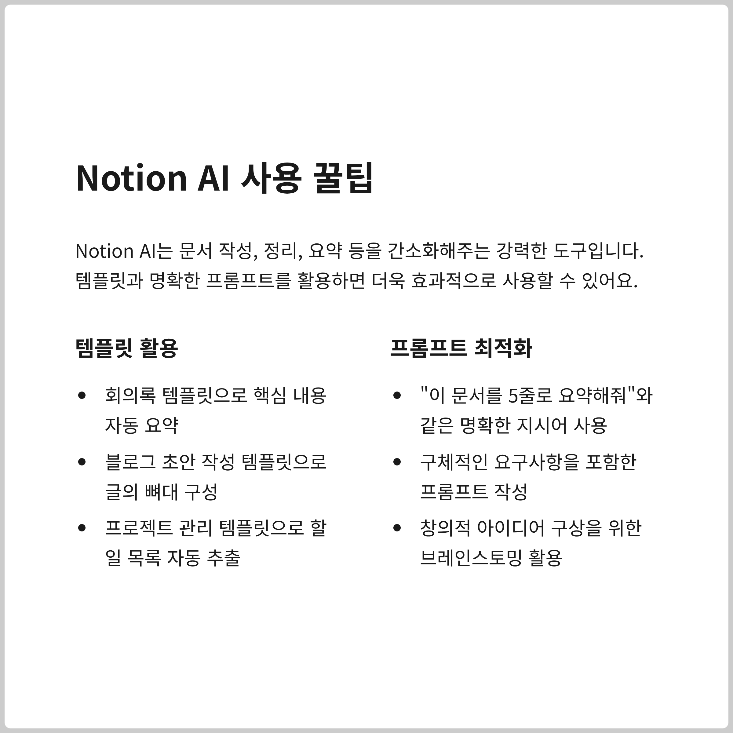또 다른 꿀팁은 'Notion AI를 위한 프롬프트'를 미리 준비해두는 것이에요. "이 문서를 5줄로 요약해줘"와 같이 명확한 지시어를 사용하면 더 정확한 결과물을 얻을 수 있어요.