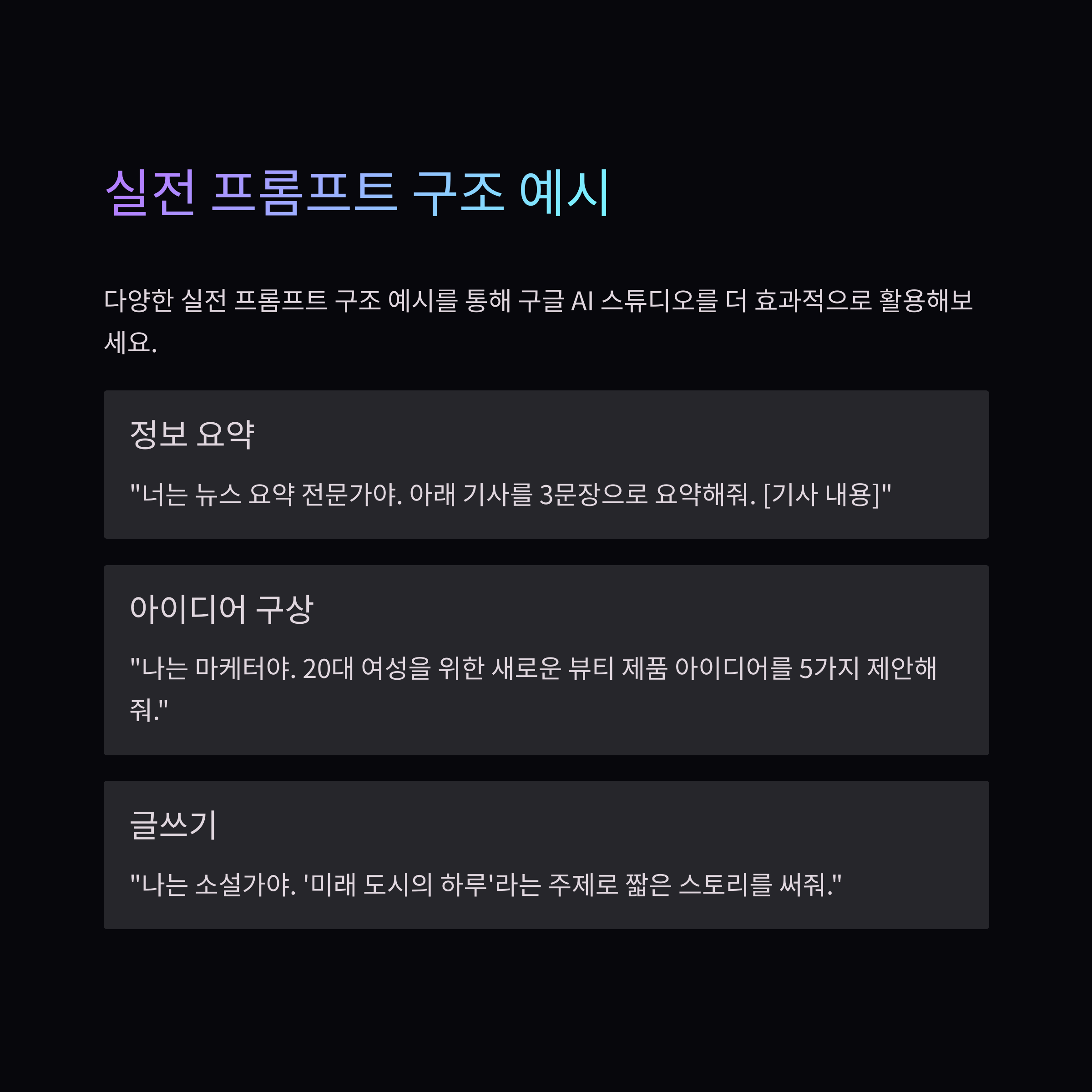 아래는 다양한 실전 프롬프트 구조 예시입니다. 각 예시는 실제 구글 AI 스튜디오에서 바로 사용할 수 있어 활용도가 높습니다.
