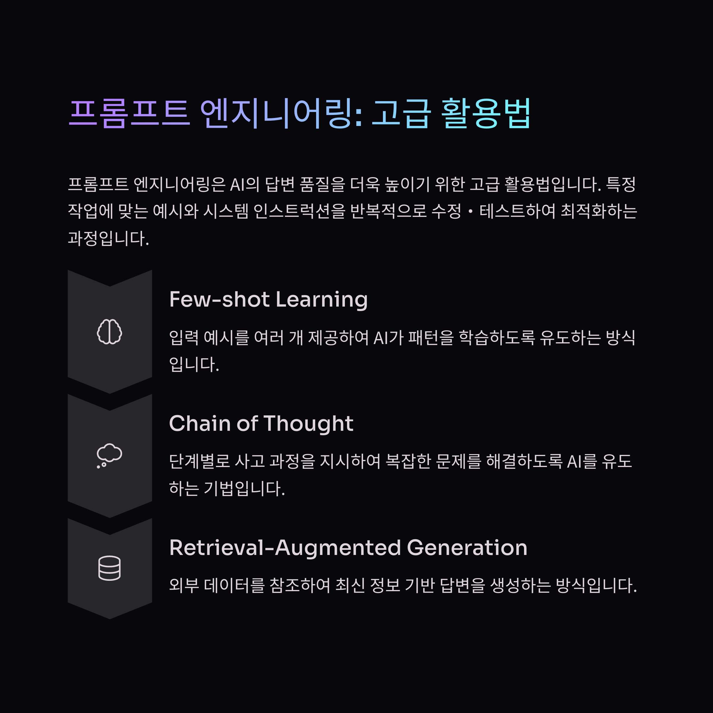 프롬프트 엔지니어링은 AI의 답변 품질을 더욱 높이기 위한 고급 활용법입니다. 특정 작업에 맞는 예시와 시스템 인스트럭션을 반복적으로 수정·테스트하여 최적화하는 과정입니다.