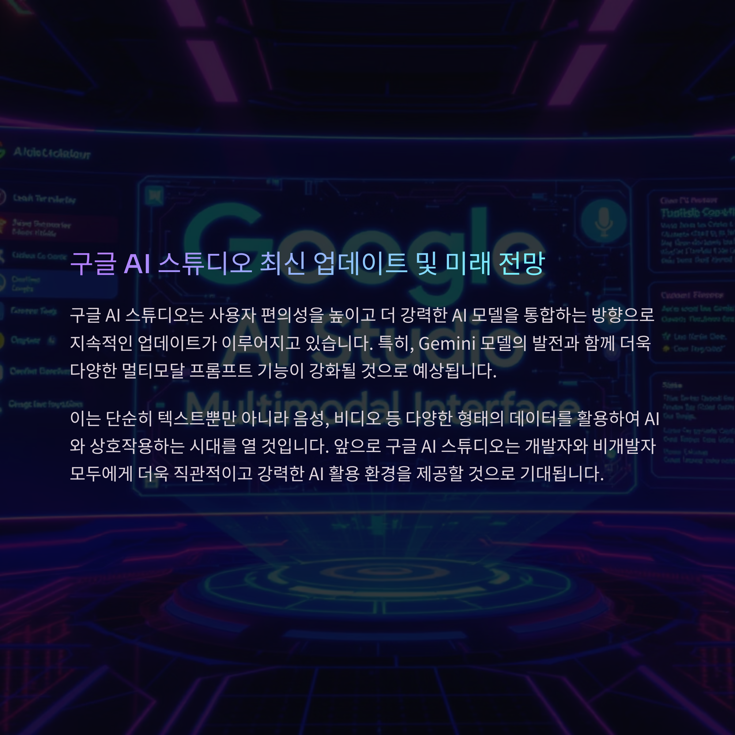 2025년 현재, 구글 AI 스튜디오는 사용자 편의성을 높이고 더 강력한 AI 모델을 통합하는 방향으로 지속적인 업데이트가 이루어지고 있습니다. 특히, Gemini 모델의 발전과 함께 더욱 다양한 멀티모달 프롬프트 기능이 강화될 것으로 예상됩니다.