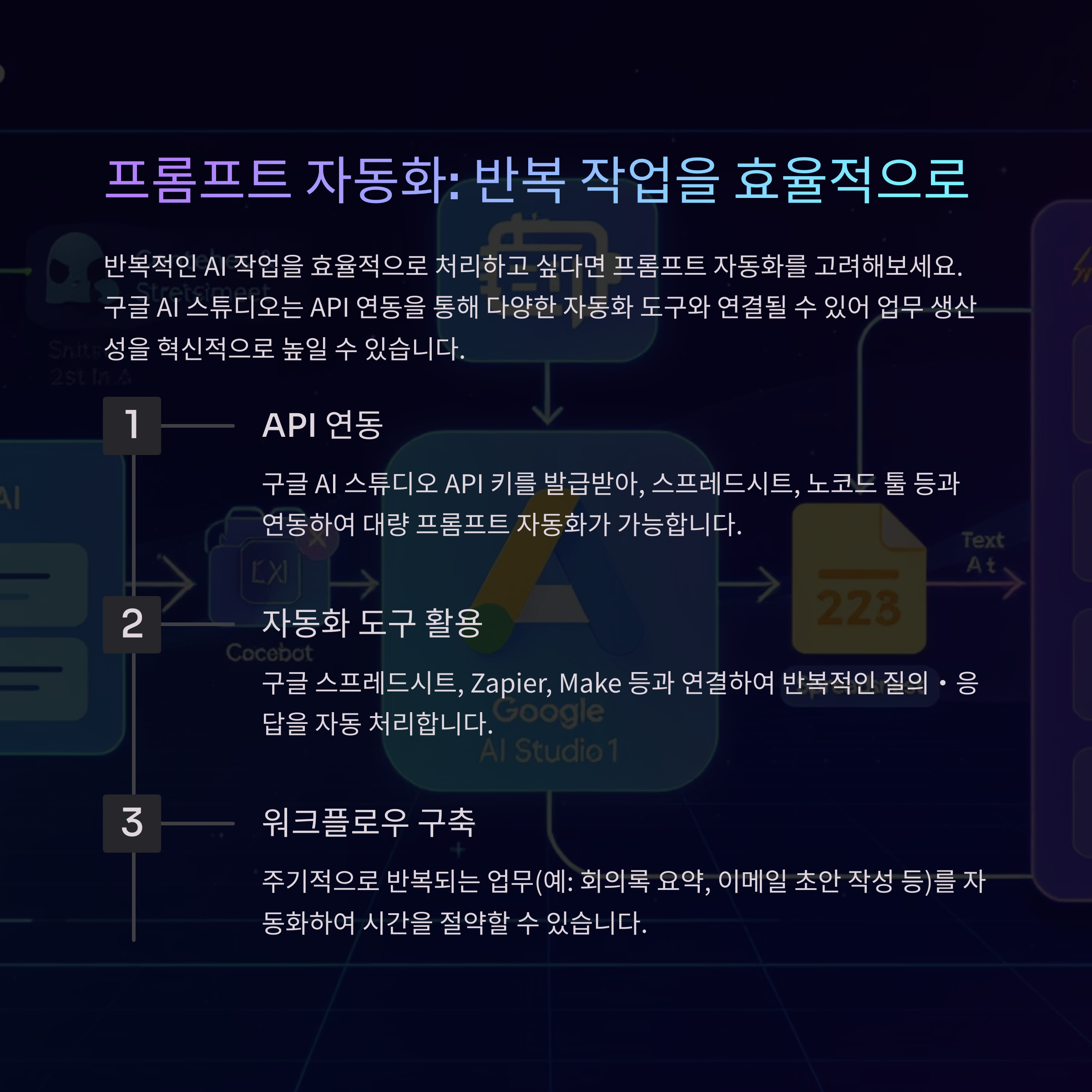반복적인 AI 작업을 효율적으로 처리하고 싶다면 프롬프트 자동화를 고려해보세요. 구글 AI 스튜디오는 API 연동을 통해 다양한 자동화 도구와 연결될 수 있어 업무 생산성을 혁신적으로 높일 수 있습니다.