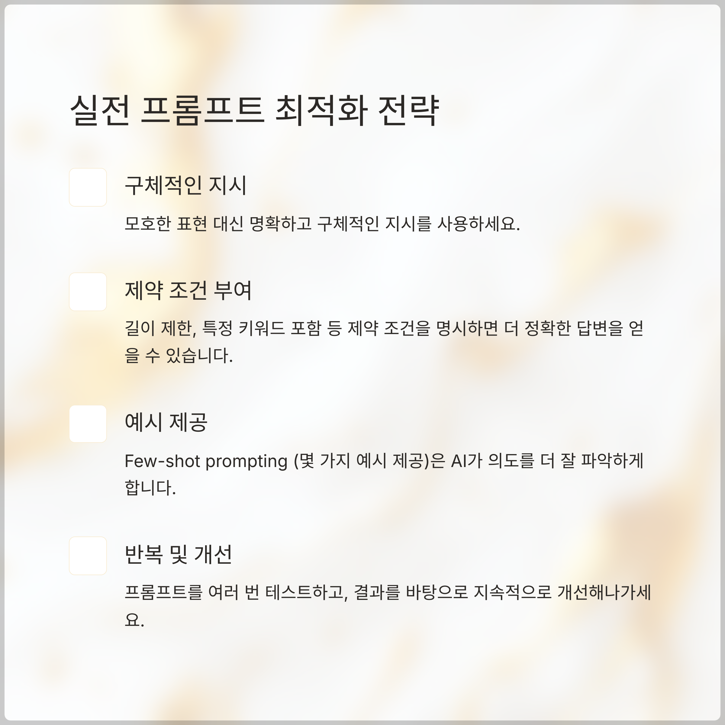 - 반복 및 개선: 프롬프트를 여러 번 테스트하고, 결과를 바탕으로 지속적으로 개선해나가세요.