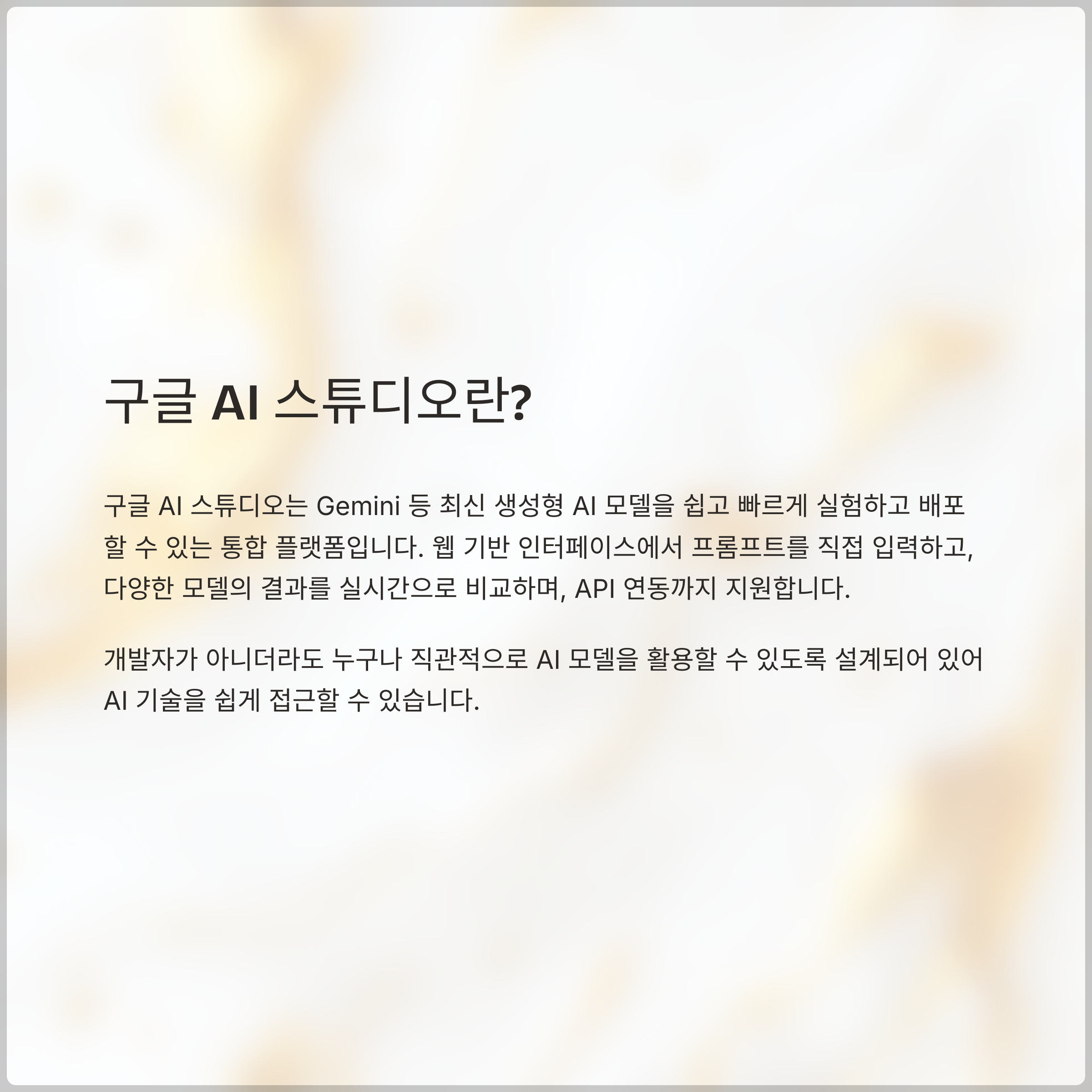 구글 AI 스튜디오는 Gemini 등 최신 생성형 AI 모델을 쉽고 빠르게 실험하고 배포할 수 있는 통합 플랫폼입니다.