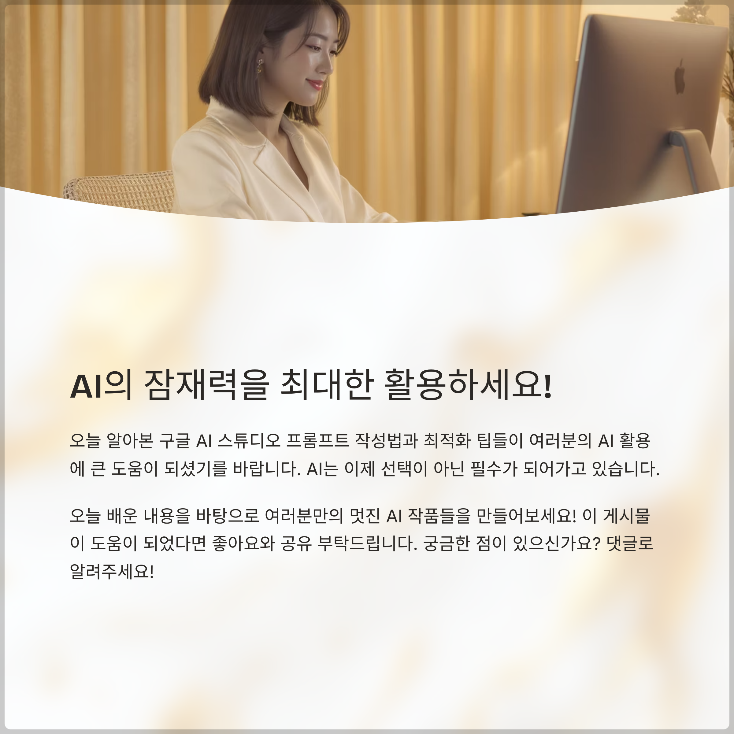 오늘 알아본 구글 AI 스튜디오 프롬프트 작성법과 최적화 팁들이 여러분의 AI 활용에 큰 도움이 되셨기를 바랍니다. AI는 이제 선택이 아닌 필수가 되어가고 있습니다. 오늘 배운 내용을 바탕으로 여러분만의 멋진 AI 작품들을 만들어보세요! 궁금한 점이 있다면 언제든 댓글로 소통해주세요. 여러분의 AI 활용을 응원합니다!