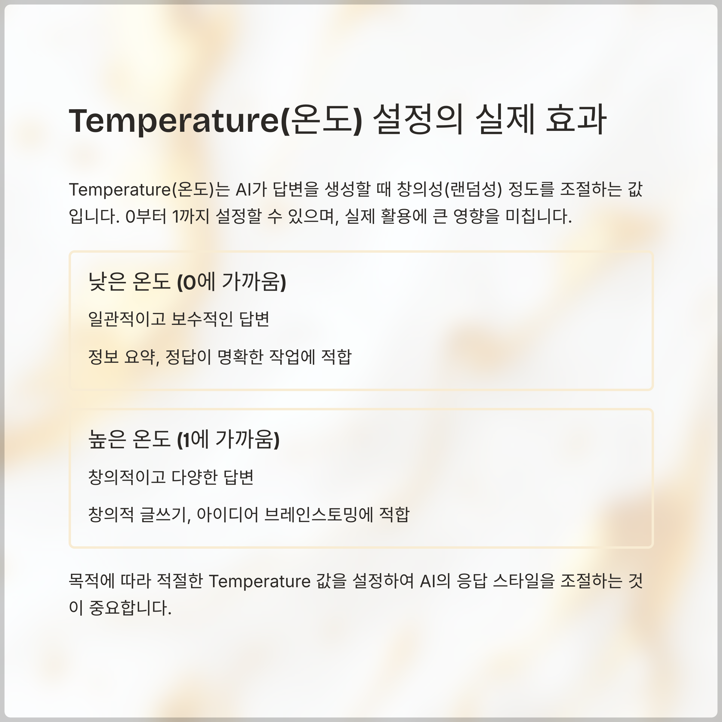 Temperature(온도)는 AI가 답변을 생성할 때 창의성(랜덤성) 정도를 조절하는 값입니다. 이 값은 0부터 1까지 설정할 수 있으며, 실제 활용에 큰 영향을 미칩니다.