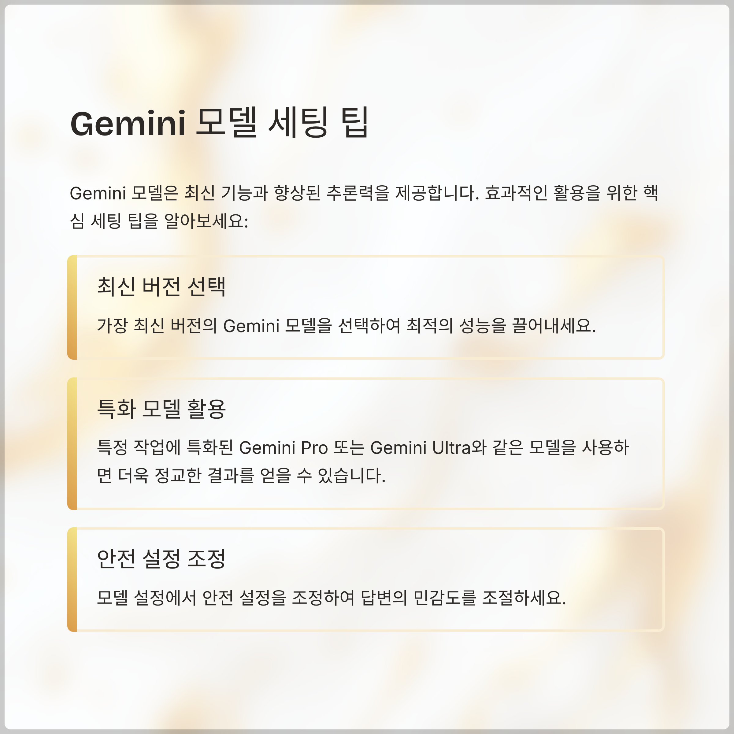 Gemini 모델은 최신 기능과 향상된 추론력을 제공합니다. 구글 AI 스튜디오에서 Gemini 모델을 효과적으로 활용하려면 다음과 같은 세팅 팁을 참고하세요.