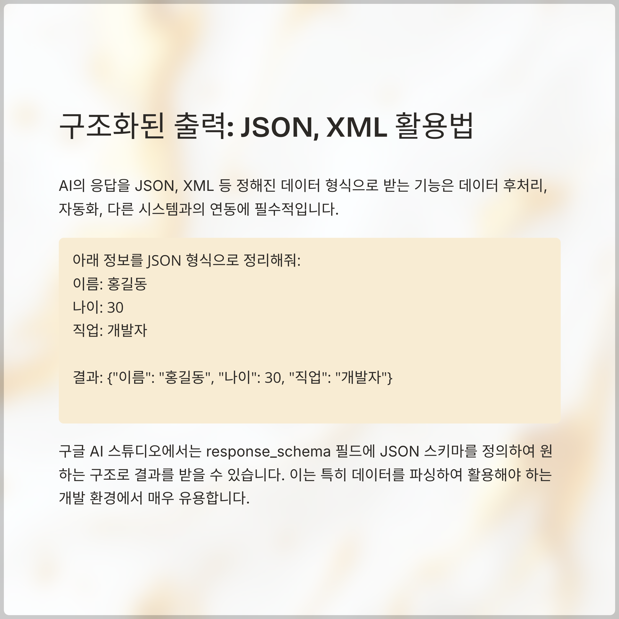 AI의 응답을 JSON, XML 등 정해진 데이터 형식으로 받는 기능은 데이터 후처리, 자동화, 다른 시스템과의 연동에 필수적입니다.