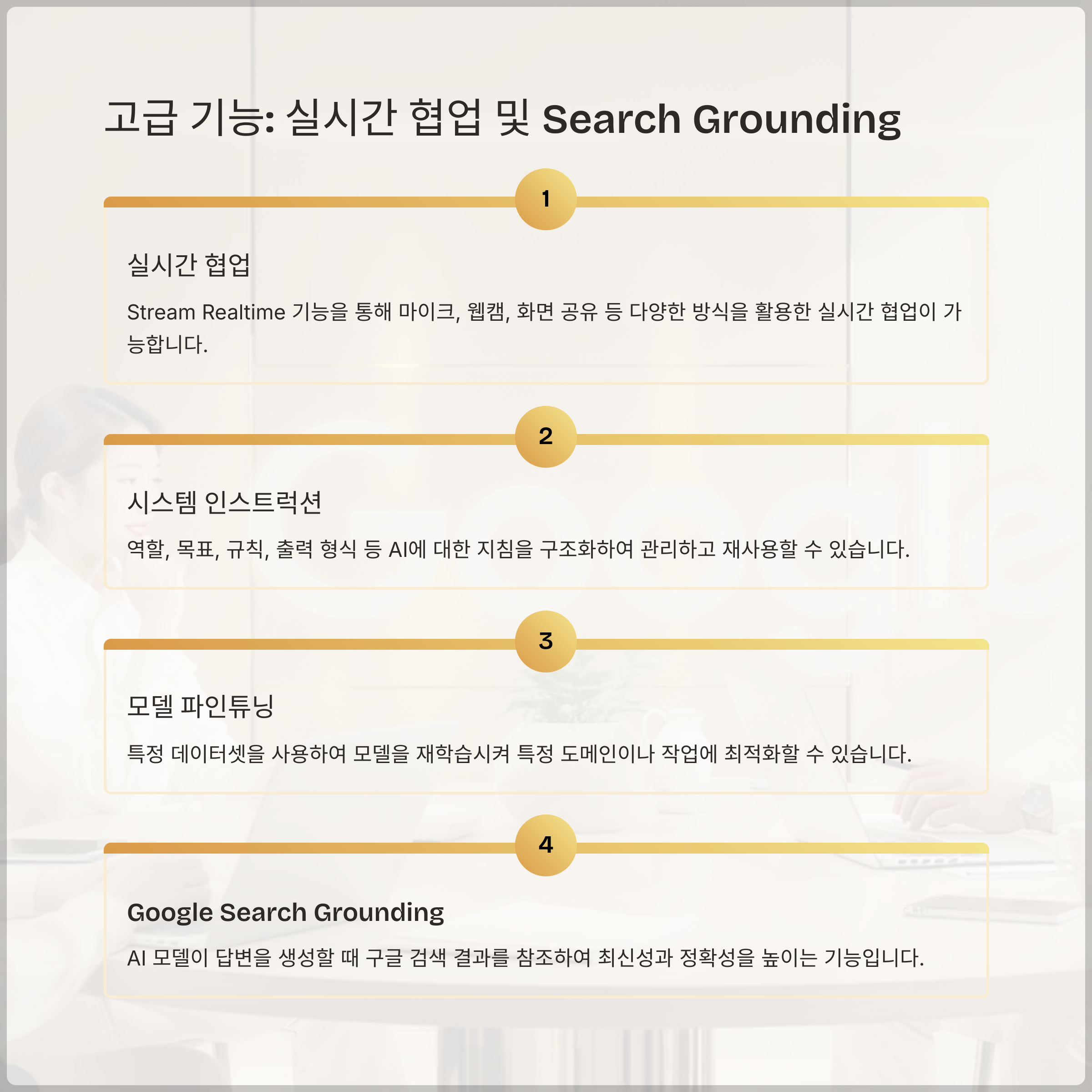 AI 모델의 성능을 한 단계 끌어올리고 싶다면 모델 파인튜닝과 Google Search Grounding을 고려해볼 수 있습니다. 모델 파인튜닝은 특정 데이터셋을 사용하여 모델을 재학습시켜 특정 도메인이나 작업에 최적화하는 과정입니다. 이를 통해 일반적인 모델로는 얻기 어려운 정교하고 특화된 답변을 얻을 수 있습니다.