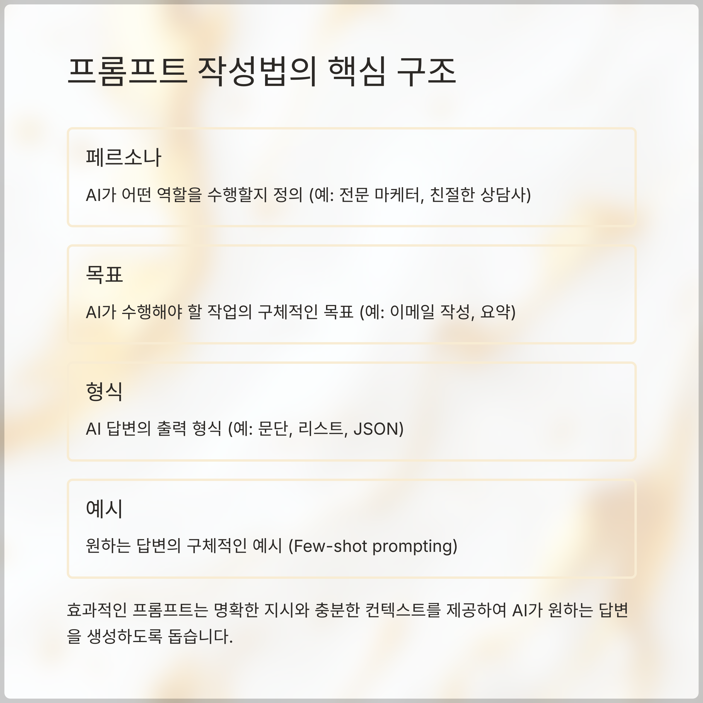 핵심 구조는 크게 페르소나, 목표, 형식, 예시로 나눌 수 있습니다.