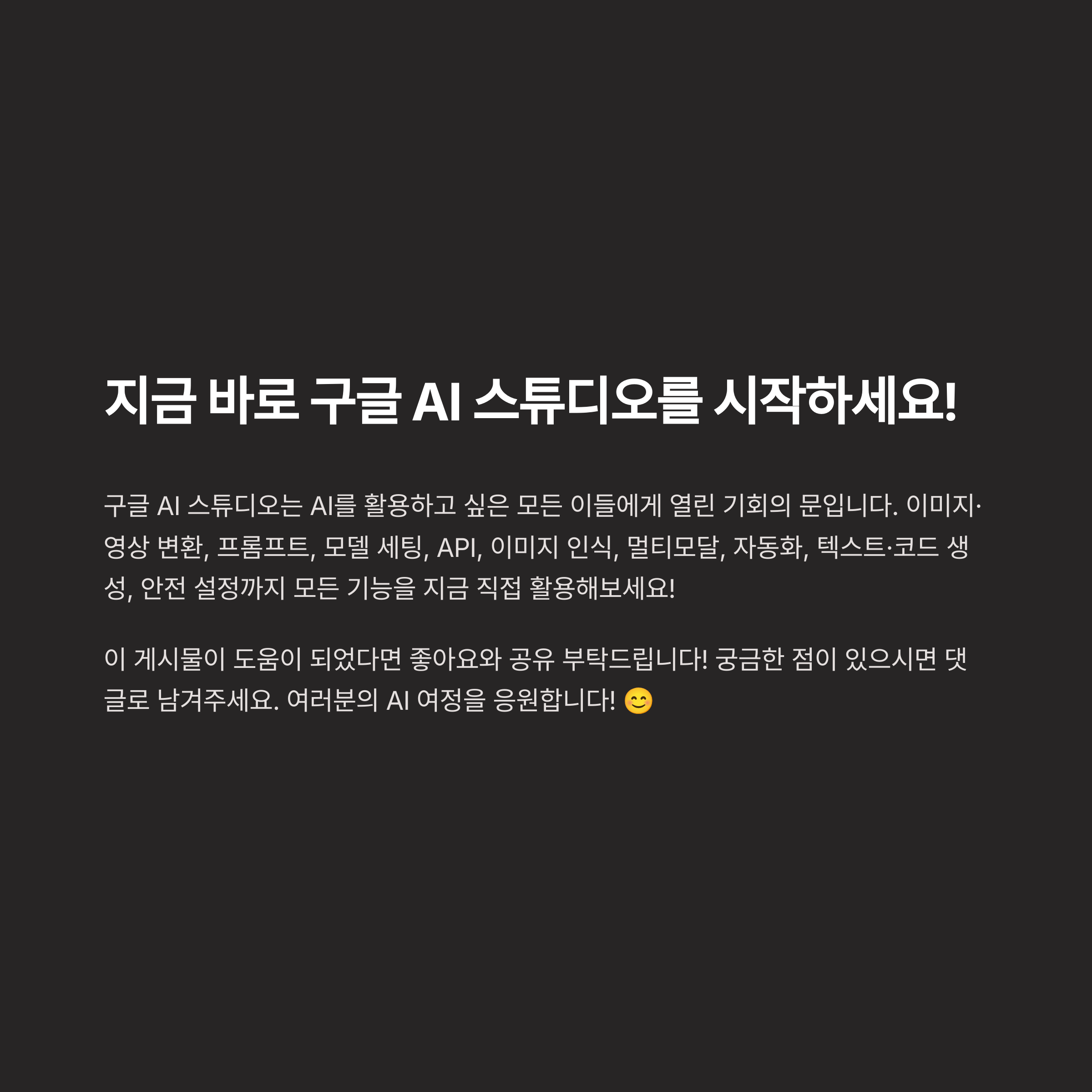 구글 AI 스튜디오는 AI를 활용하고 싶은 모든 이들에게 열린 기회의 문입니다. 지금 바로 시작하여 여러분의 아이디어를 현실로 만들고, 궁금한 점은 댓글로 소통하며 함께 성장해나가요! 여러분의 AI 여정을 응원합니다.😊
