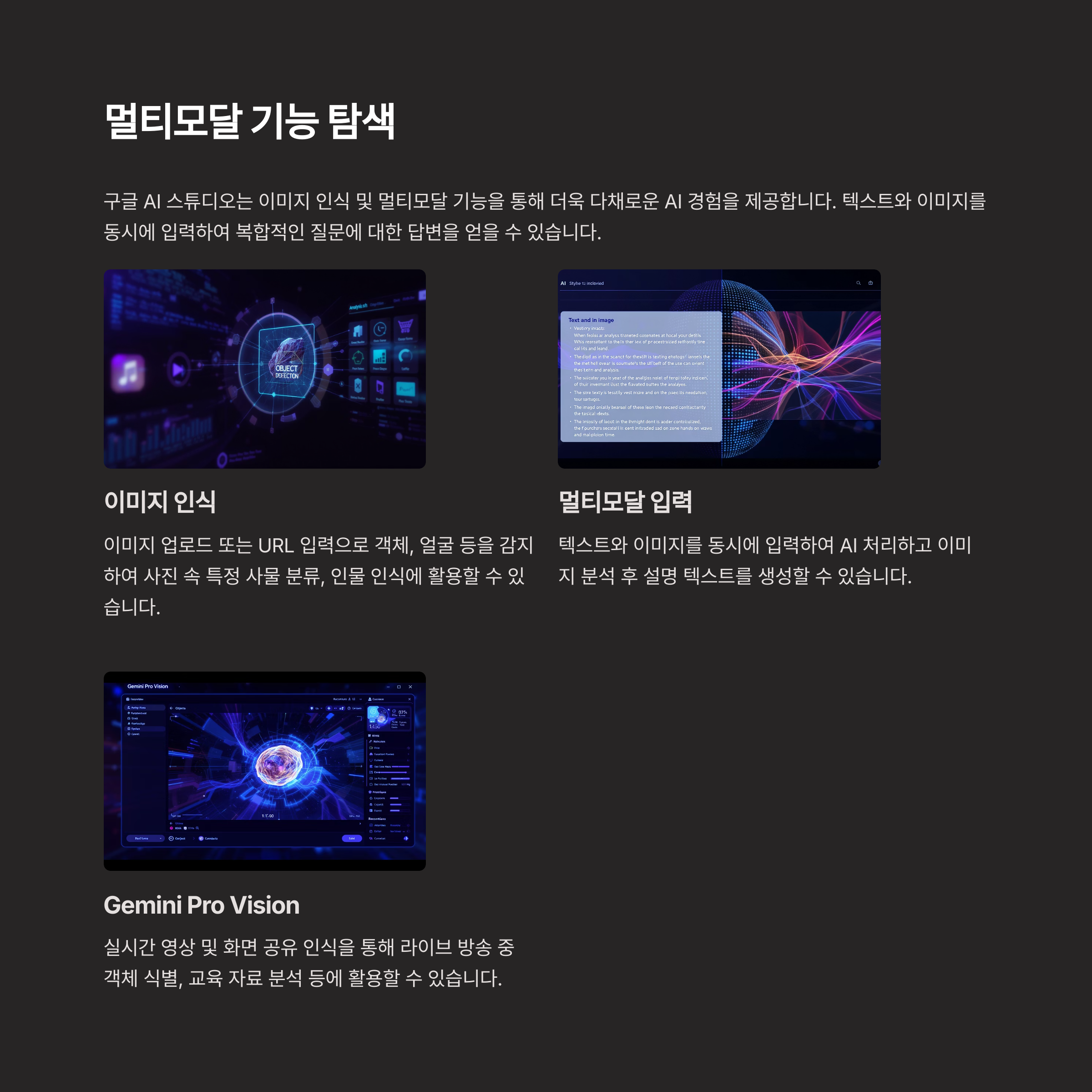 | Gemini Pro Vision | 실시간 영상 및 화면 공유 인식 | 라이브 방송 중 객체 식별, 교육 자료 분석 |