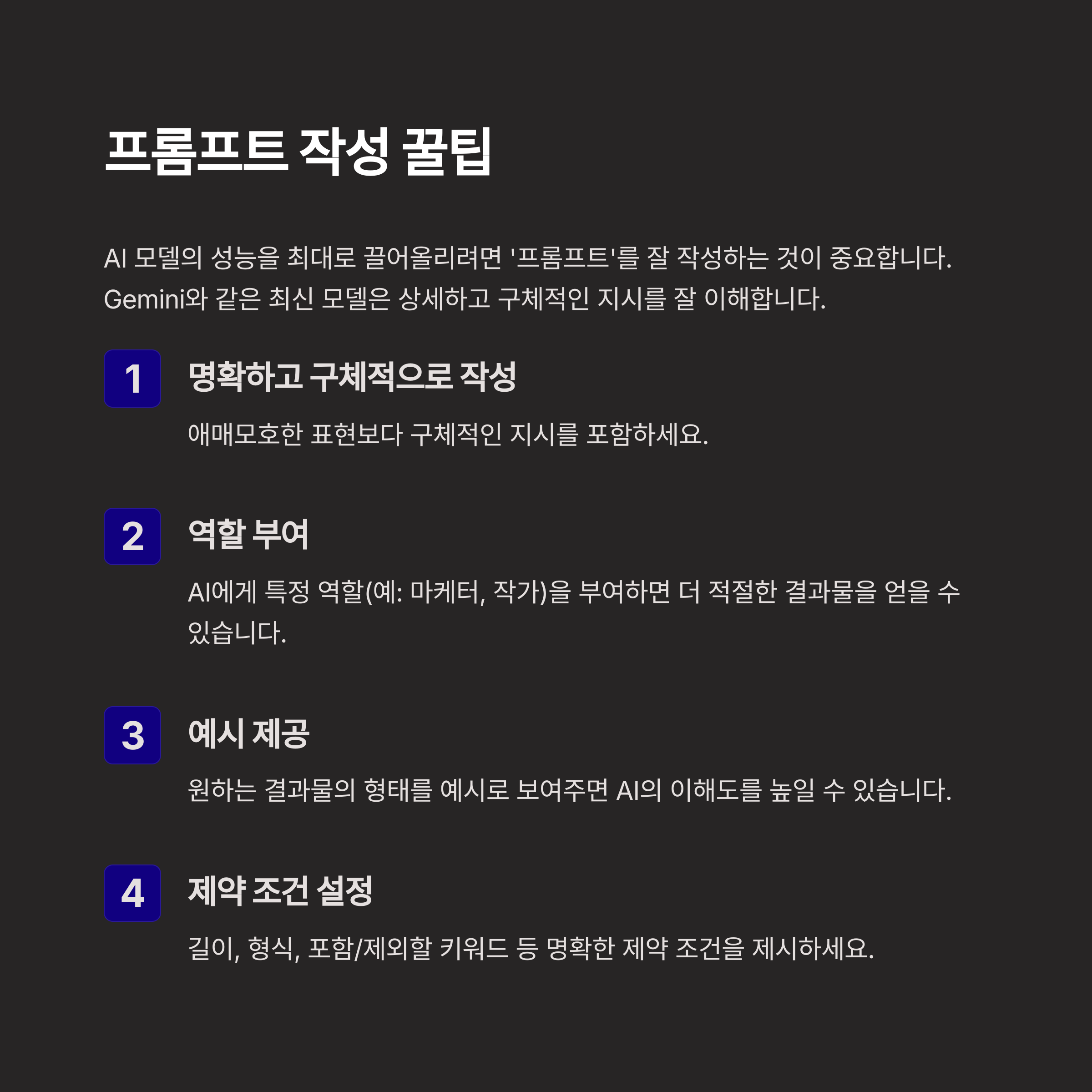AI 모델의 성능을 최대로 끌어올리려면 '프롬프트'를 잘 작성하는 것이 중요합니다. 특히 Gemini와 같은 최신 모델은 상세하고 구체적인 지시를 잘 이해합니다. 몇 가지 꿀팁을 통해 여러분의 프롬프트 작성 능력을 향상시켜 보세요.