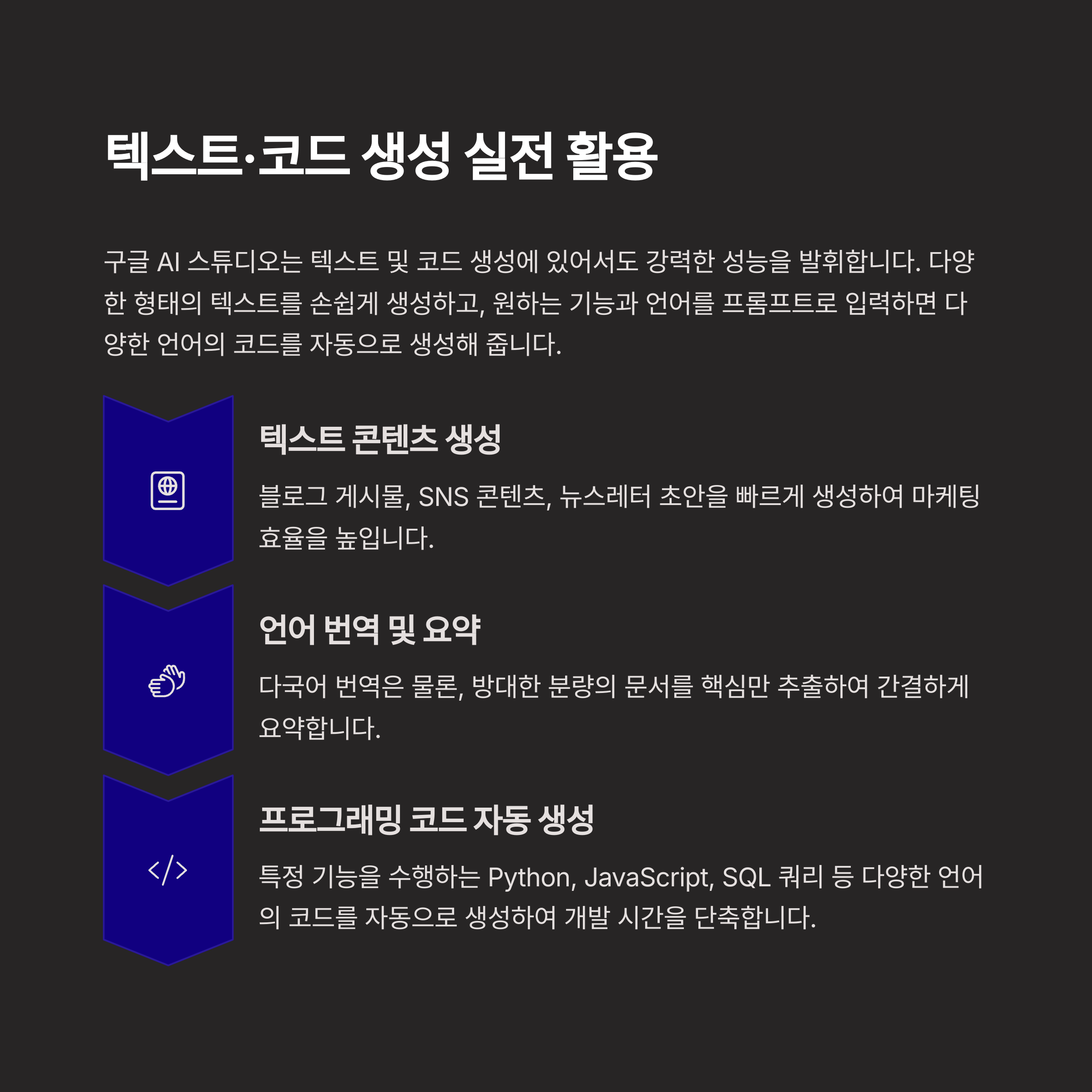 구글 AI 스튜디오는 텍스트 및 코드 생성에 있어서도 강력한 성능을 발휘합니다. 블로그 글, SNS 콘텐츠, 뉴스 요약 등 다양한 형태의 텍스트를 손쉽게 생성할 수 있으며, 자연어 처리, 번역, 감정 분석 등 복잡한 작업도 지원합니다. 또한, 개발자를 위한 코드 생성 기능은 원하는 기능과 언어를 프롬프트로 입력하면 Python, JavaScript, Java 등 다양한 언어의 코드를 자동으로 생성해 줍니다.