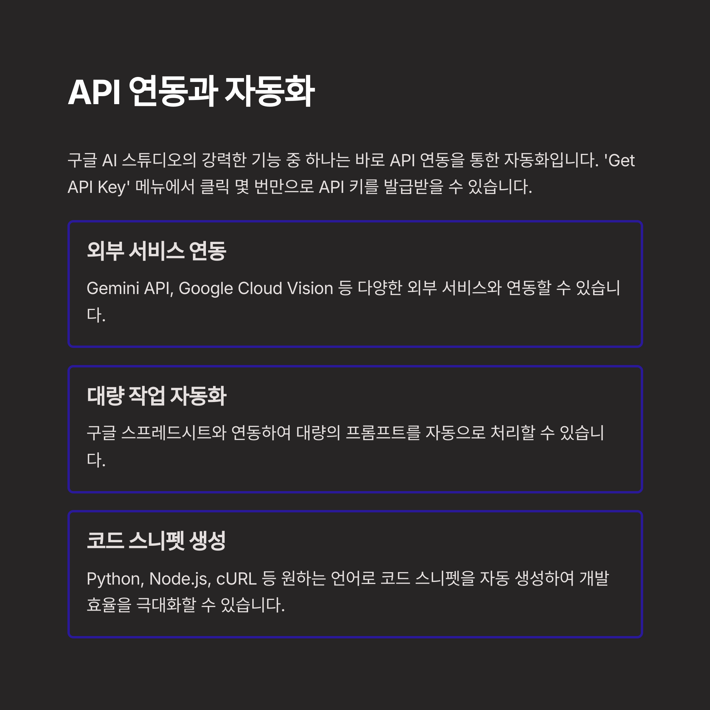 API 연동을 통해 구글 AI 스튜디오의 기능을 다른 애플리케이션이나 서비스에 통합하여 사용할 수 있습니다. 이를 통해 대량의 작업을 자동화하거나, 자신만의 맞춤형 AI 솔루션을 개발하는 등 업무 효율성을 극대화할 수 있습니다.