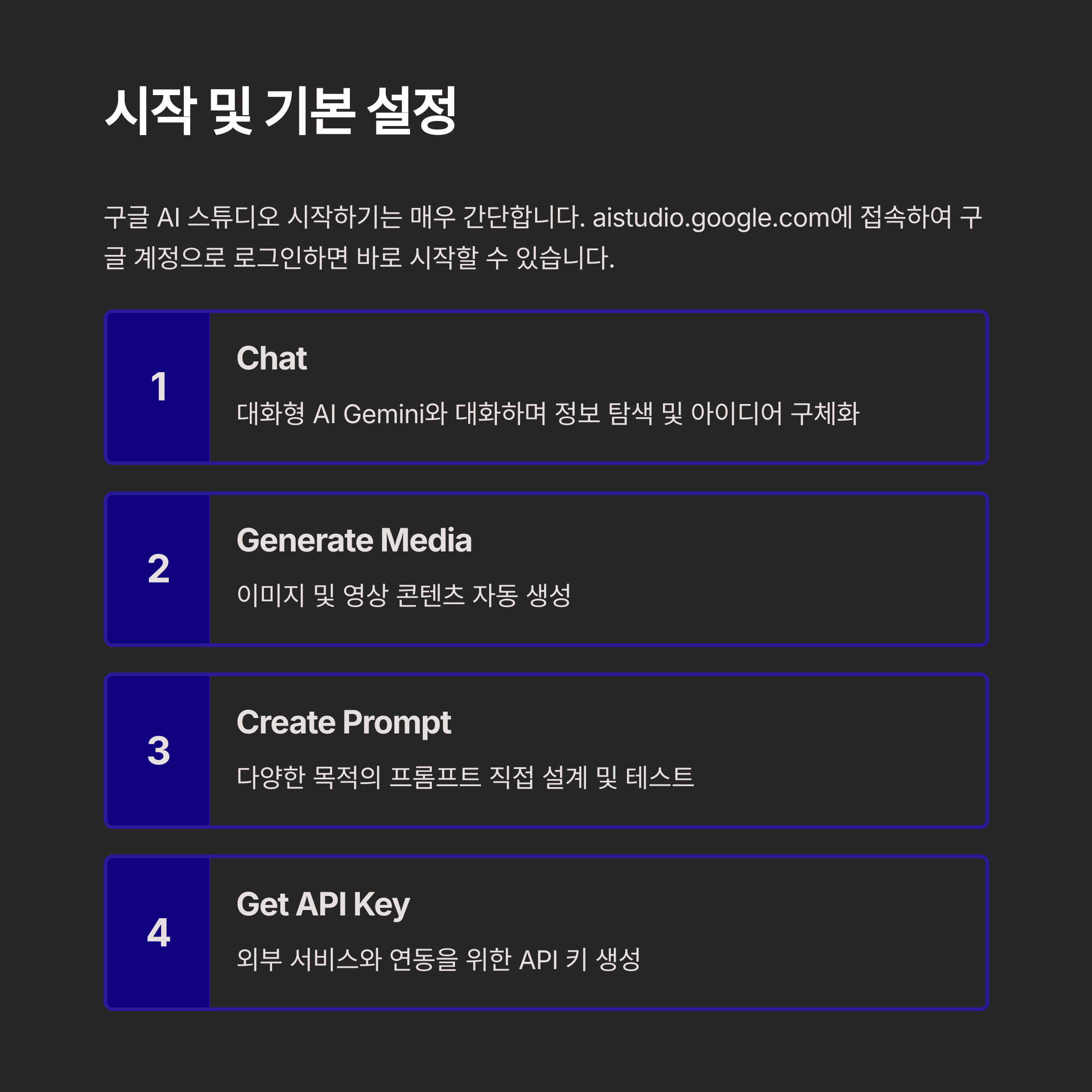 구글 AI 스튜디오를 시작하는 방법은 매우 간단합니다. aistudio.google.com에 접속하여 구글 계정으로 로그인하기만 하면 됩니다. 로그인 후 좌측 메뉴에서 다양한 기능을 활용할 수 있습니다. 대부분의 기능은 무료로 제공되므로 부담 없이 체험해 볼 수 있습니다.