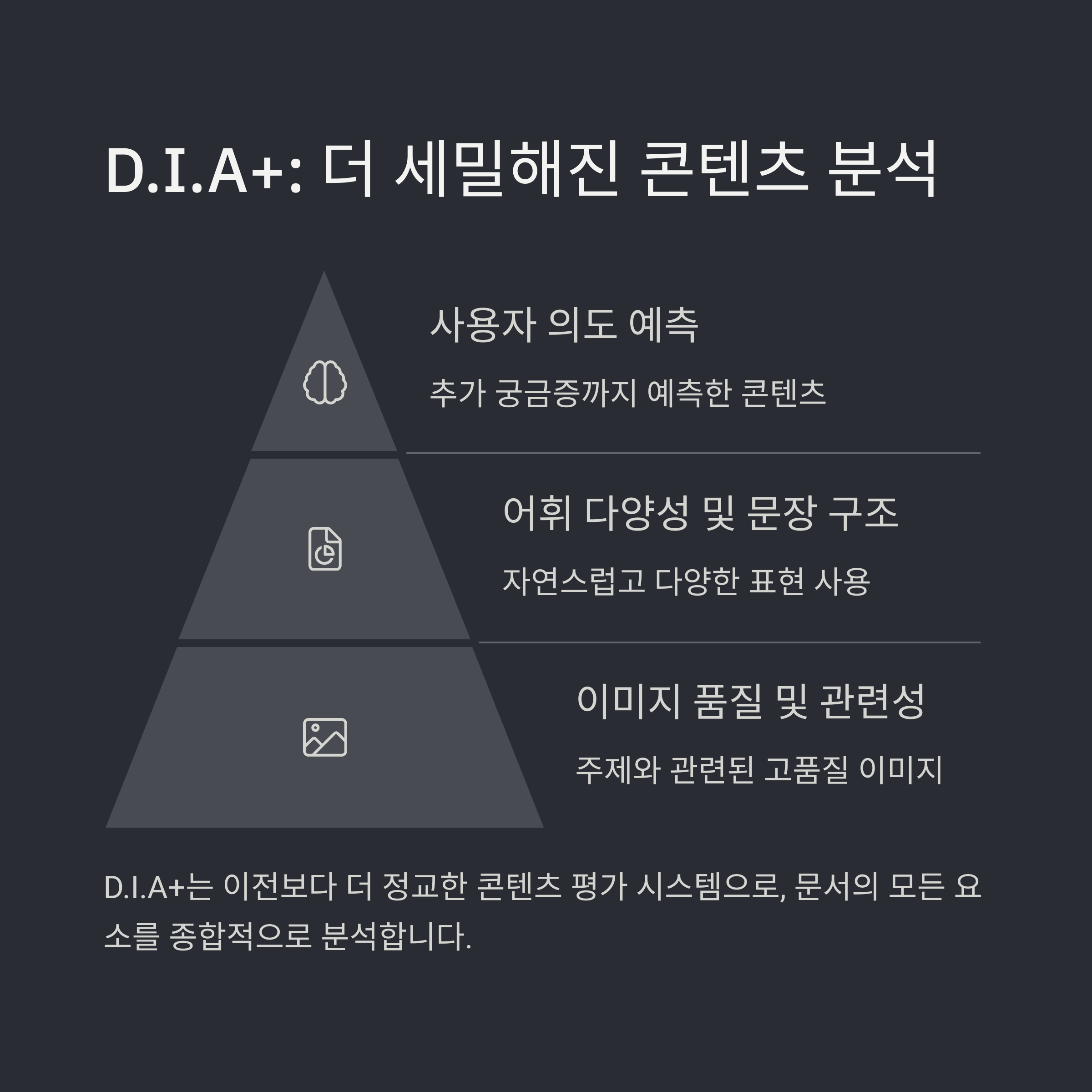 2025년 네이버 검색 알고리즘은 두 가지 핵심 축, C-Rank와 D.I.A(Digital Intent Analysis)로 진화했습니다. C-Rank는 블로그나 채널 전체의 영향력을, D.I.A는 개별 문서의 정보 완성도와 사용자 의도 부합도를 평가합니다. 최근에는 ‘D.I.A+’로 고도화되어, 이미지, 문장 구조, 어휘 선택 등 세부적인 요소까지 분석합니다. 단순히 키워드를 많이 넣는 방식은 더 이상 통하지 않으며, 콘텐츠의 신뢰성과 실제 사용자 경험이 중심이 되었습니다.