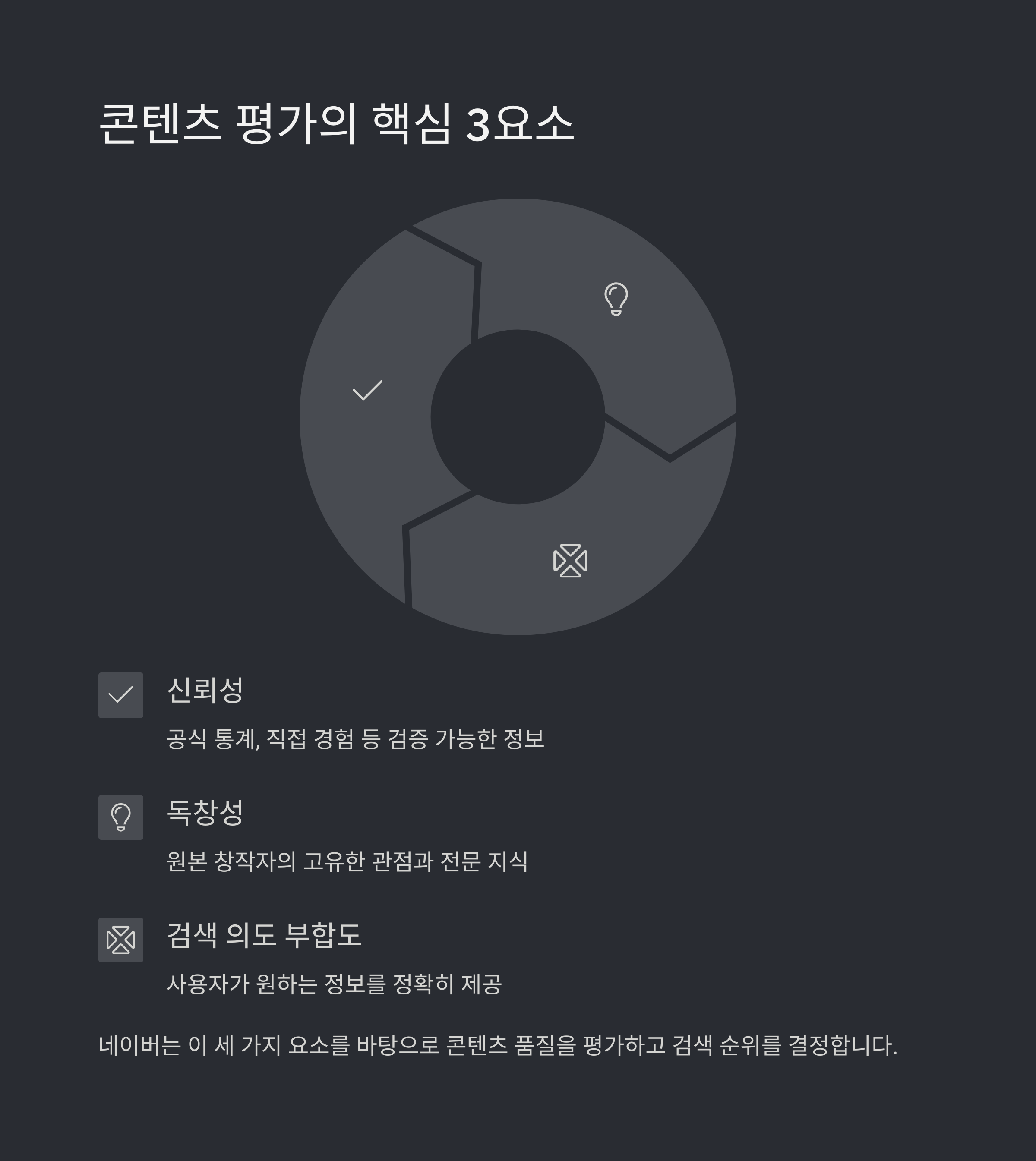네이버는 단순한 정보 나열이 아닌, ‘사람 중심’ 콘텐츠를 우선 평가합니다. 아래는 네이버가 공식적으로 밝힌 콘텐츠 평가 기준을 요약한 내용입니다.