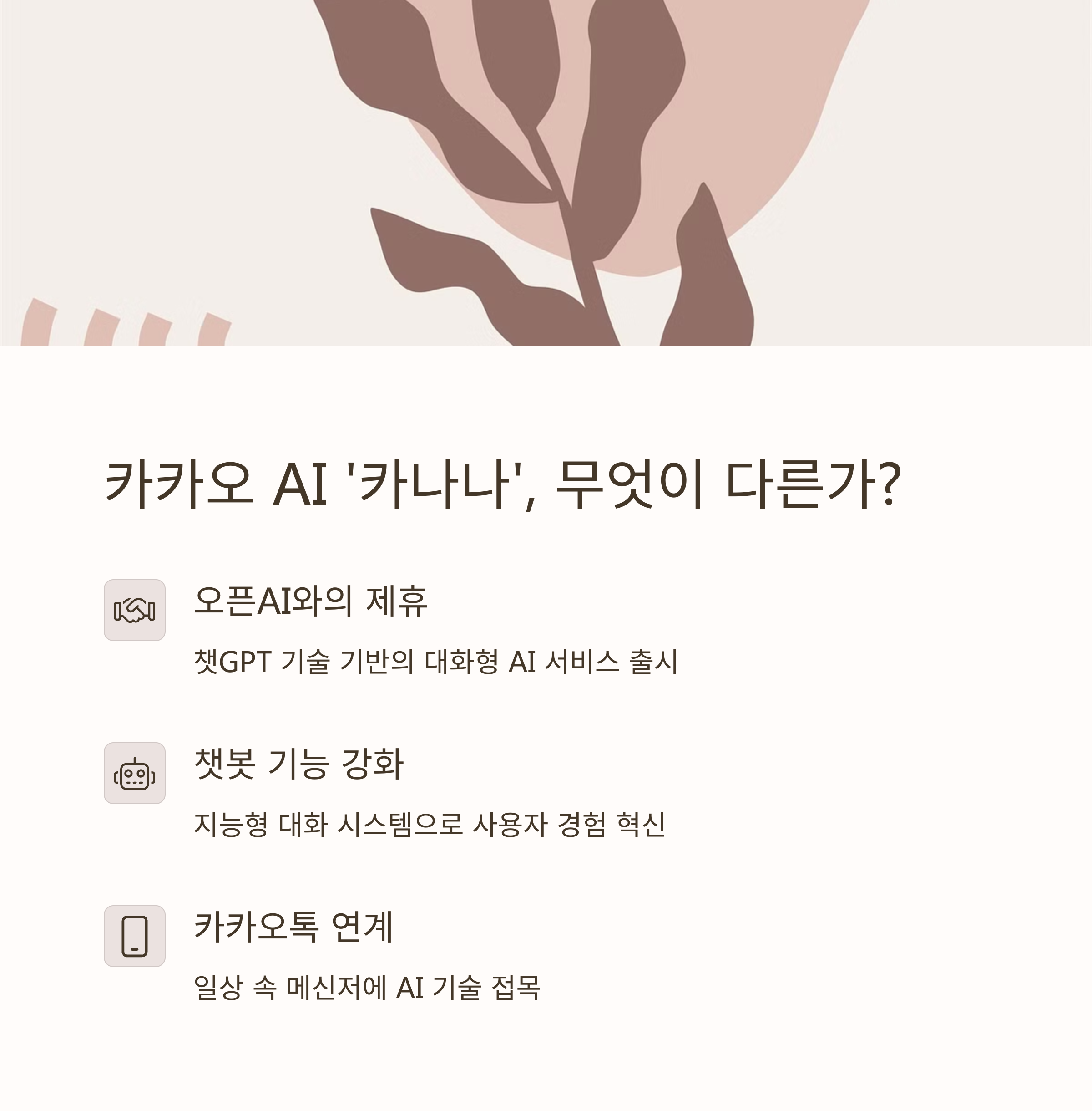 카카오는 오픈AI와의 제휴를 통해 생성형 AI를 적극 도입하고 있으며, 대화형 AI ‘카나나’를 비롯해 콘텐츠 추천, 요약, 자동 응답 등의 기능을 통해 블로그 경험을 혁신하고 있습니다. 주요 변화는 아래와 같습니다.