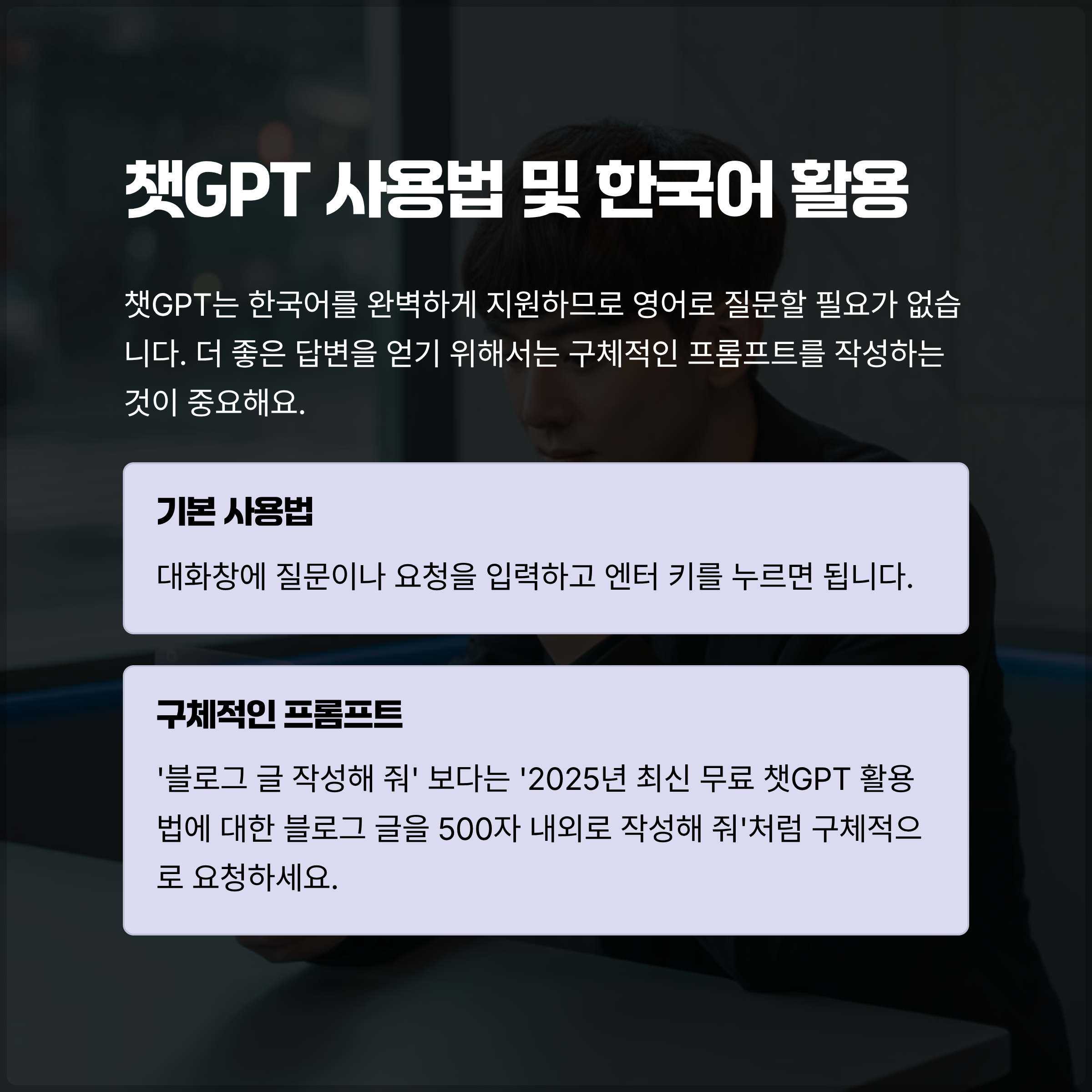 한국어로 질문하면 한국어로 답변을 받을 수 있답니다. 더 좋은 답변을 얻고 싶다면, 질문을 구체적으로 작성하는 것이 중요해요. 예를 들어, '블로그 글 작성해 줘'보다는 '2025년 최신 무료 챗GPT 활용법에 대한 블로그 글을 500자 내외로 작성해 줘'와 같이 구체적인 지시를 내리는 것이 훨씬 효과적이에요.