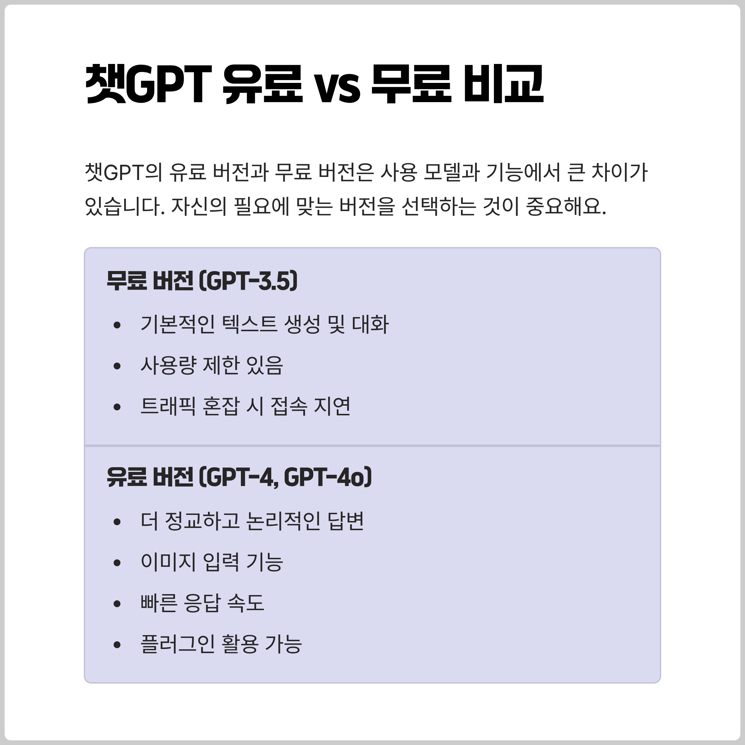 챗GPT 유료 버전은 무료 버전보다 훨씬 강력한 성능을 자랑해요. 무료 버전이 GPT-3.5를 사용하는 반면, 유료 버전인 챗GPT Plus는 최신 모델인 GPT-4와 GPT-4o를 이용할 수 있답니다.
