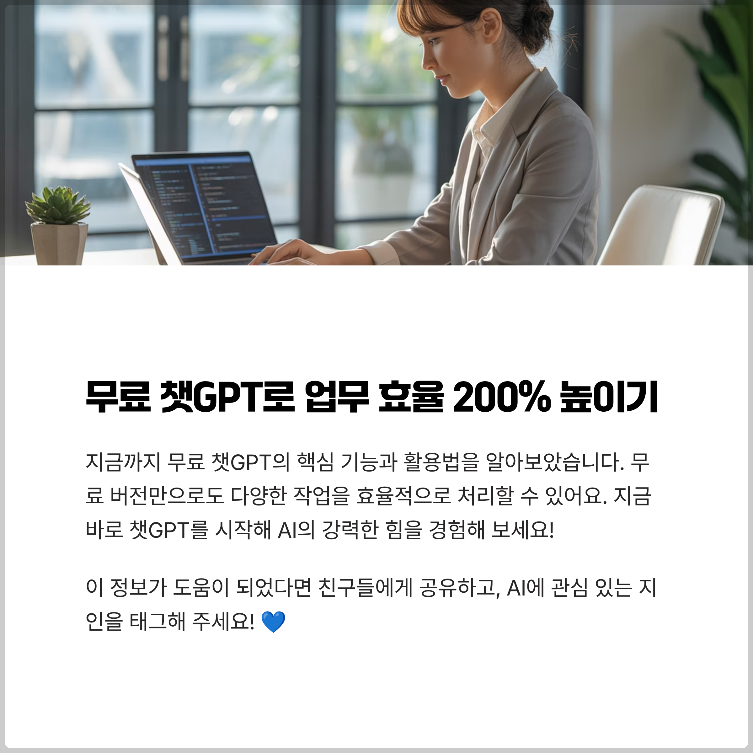 많은 사람들이 챗GPT를 통해 업무 효율을 높이고 있는 이유가 바로 이 때문이에요. 챗GPT 무료를 통해 AI의 강력한 힘을 체험해 보세요.