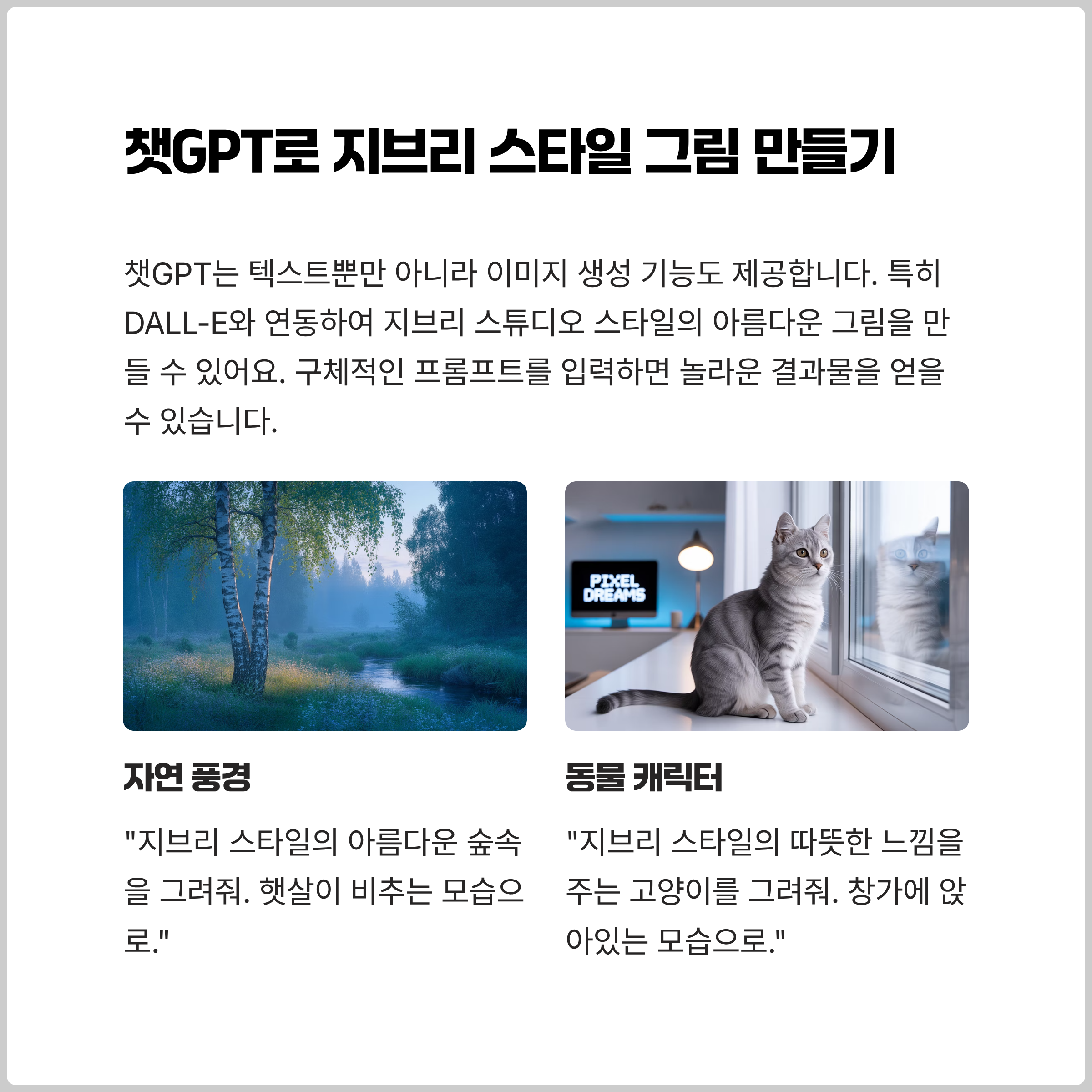 - 프롬프트 예시: "지브리 스타일의 따뜻한 느낌을 주는 고양이를 그려줘. 창가에 앉아 바깥을 바라보는 모습이면 좋겠어."
