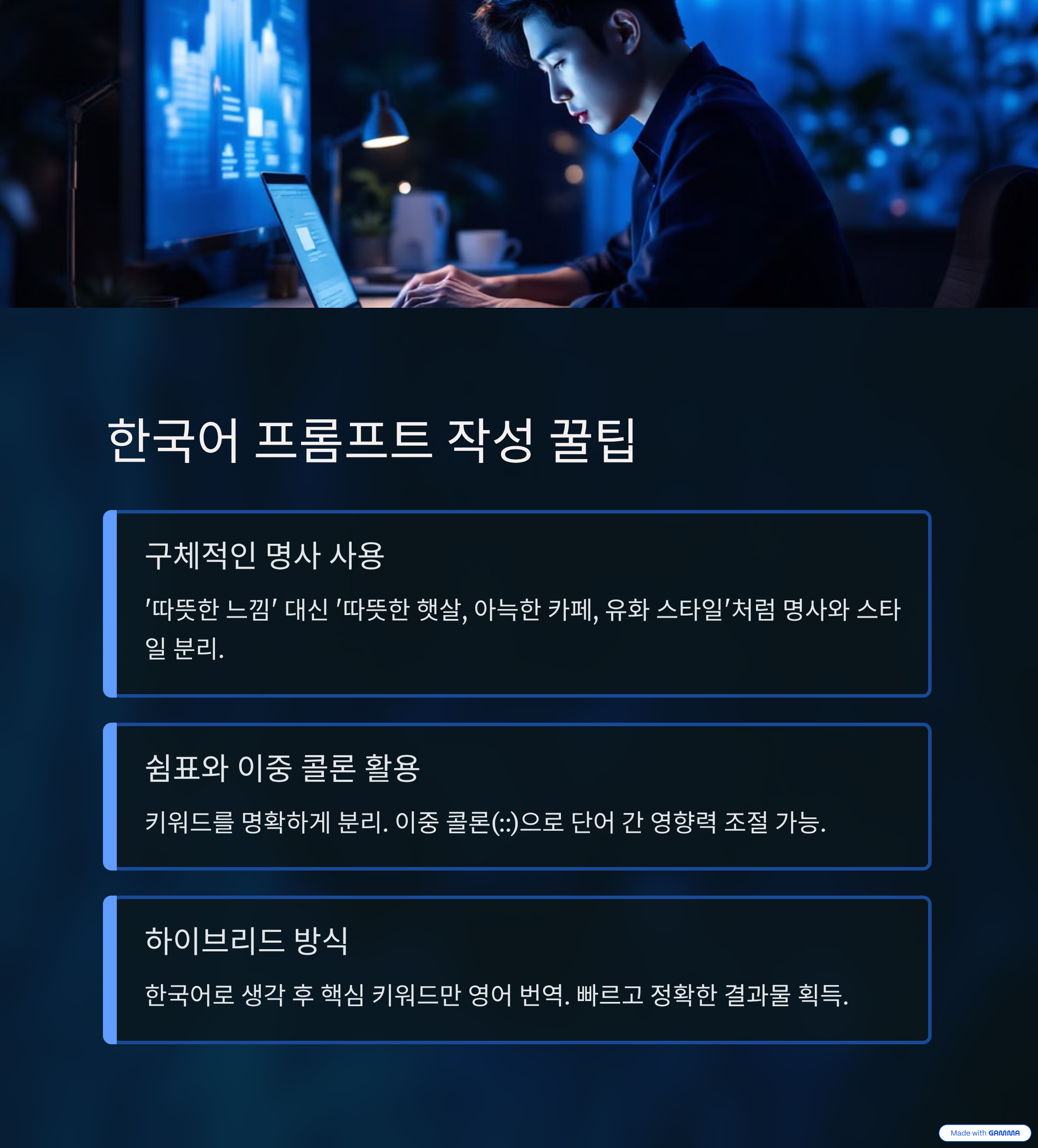 예를 들어, '따뜻한 느낌의 그림' 대신 '따뜻한 햇살, 아늑한 카페, 유화 스타일'처럼 명사와 스타일을 분리해서 작성해야 합니다. 또한, 관용적인 표현이나 복잡한 문장보다는 **쉼표(,)나 이중 콜론(::)**을 활용해 키워드를 명확하게 분리하는 것이 좋아요.