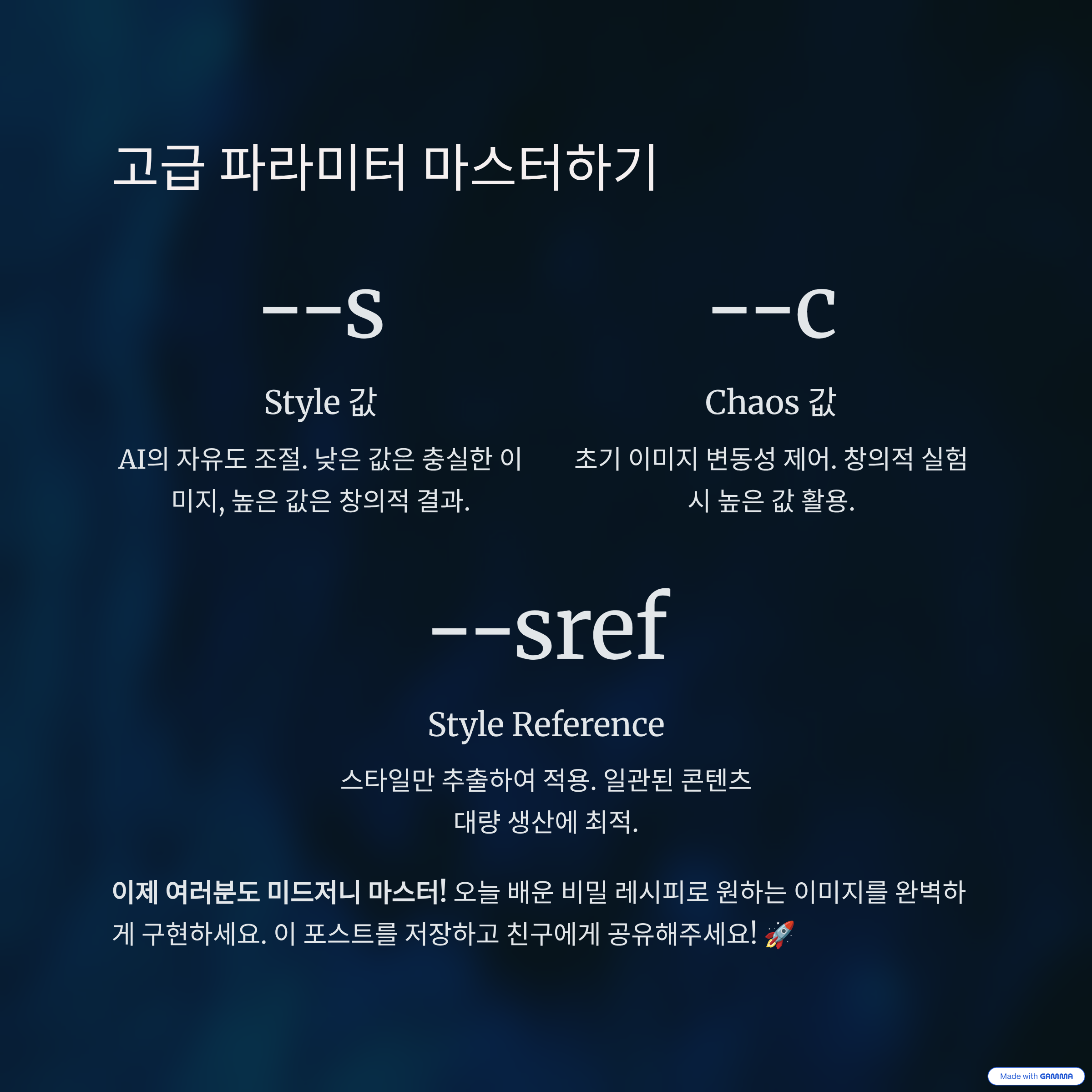 예를 들어, `--s (Style)` 값은 AI가 프롬프트를 얼마나 자유롭게 해석할지 결정합니다. 낮은 `--s` 값은 프롬프트에 충실한 이미지를, 높은 값은 창의적이지만 예상치 못한 이미지를 생성합니다.