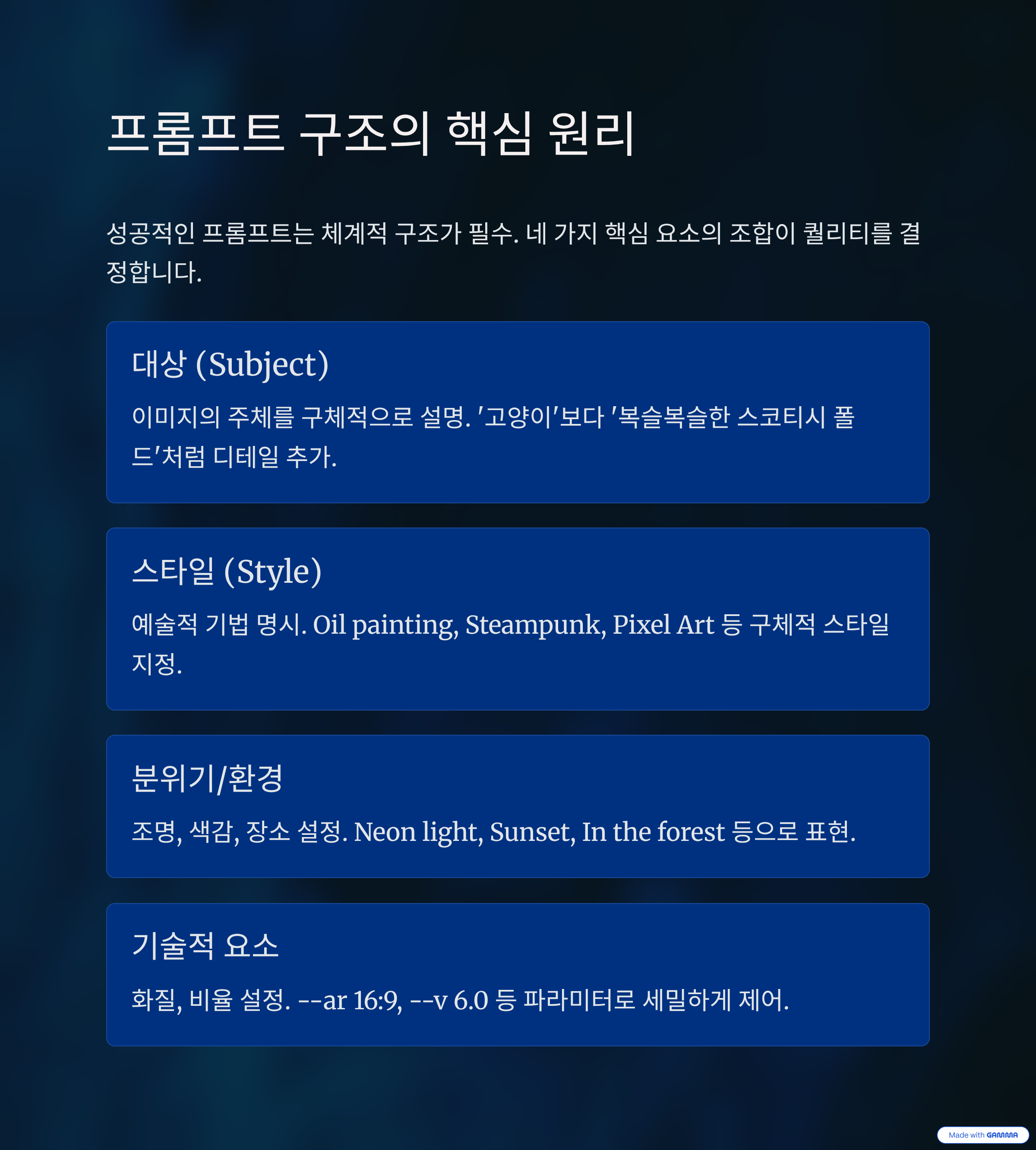 성공적인 **미드저니 프롬프트**는 단순히 단어를 나열하는 것이 아니라, 체계적인 구조를 갖추고 있어요. 프롬프트 구조의 핵심은 AI에게 "무엇을(대상)", "어떤 스타일로(스타일)", "어떤 분위기에서(분위기)", "어떤 기술적 요소로(파라미터)" 만들지 명확하게 지시하는 것입니다.