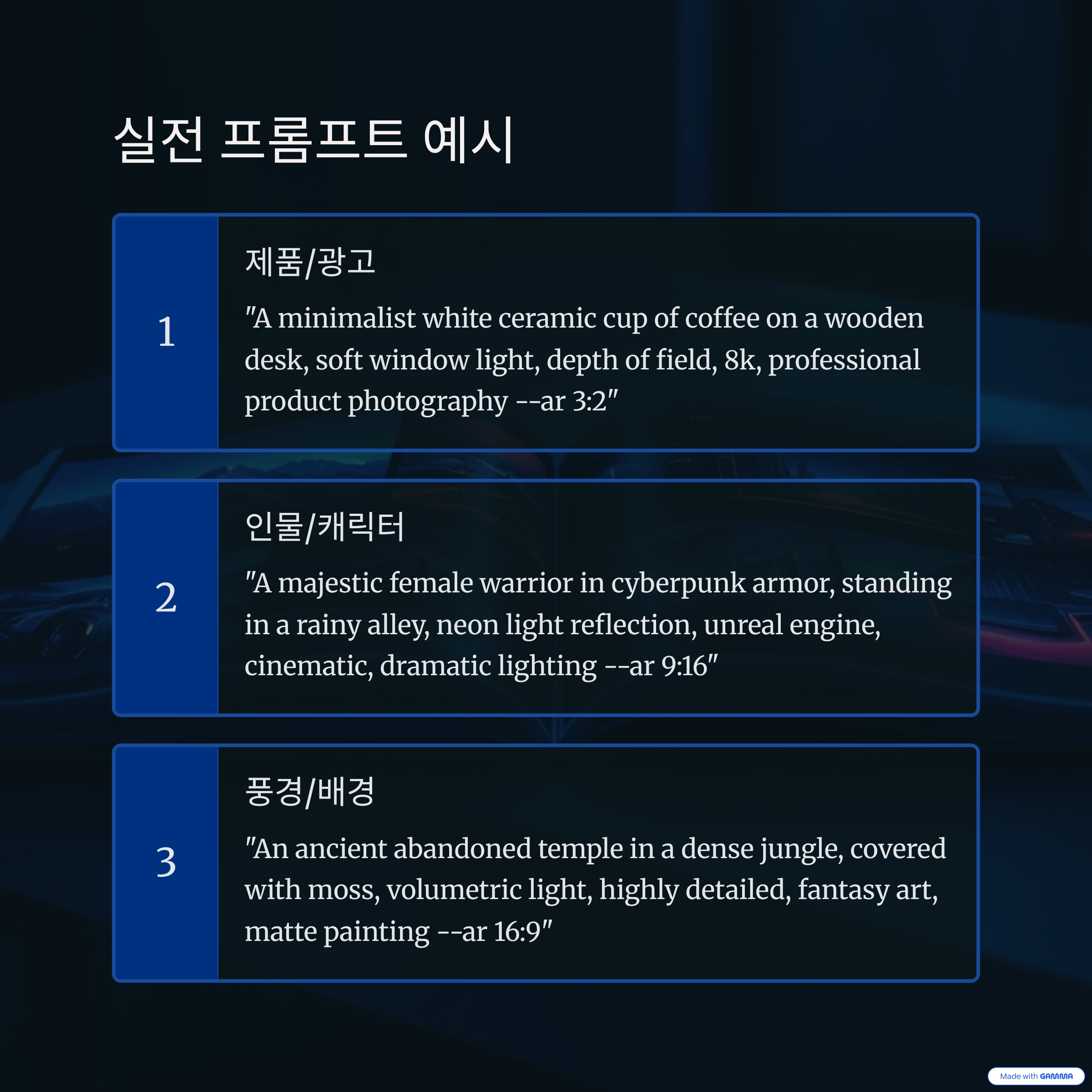 | 기술적 요소 (Parameter) | 화질, 비율 등 설정 (예: --ar 16:9, --v 6.0) |