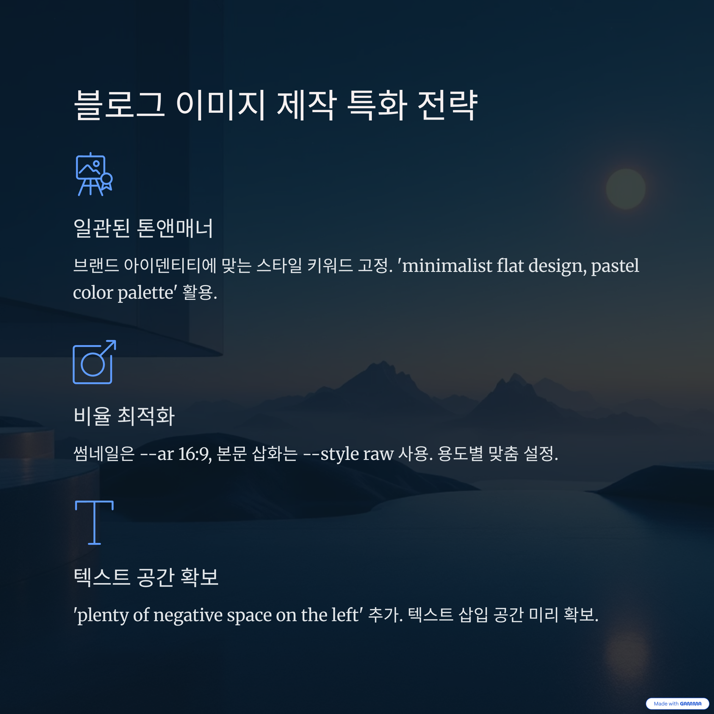 또한, 블로그의 **썸네일 비율**과 **본문 삽화 비율**을 고려하여 `--ar` (Aspect Ratio) 파라미터를 정확하게 설정해야 합니다.