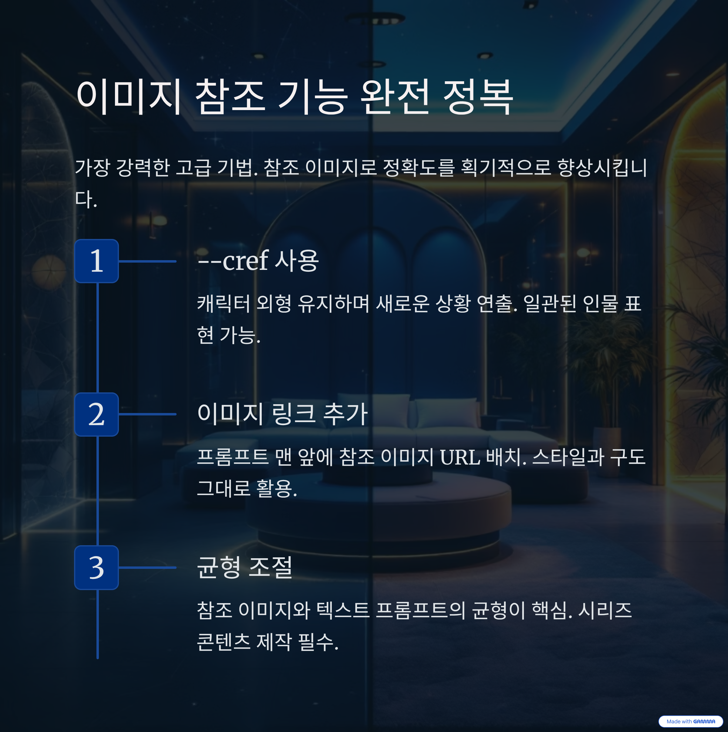 원하는 결과물을 얻기 위한 가장 강력한 고급 기법 중 하나는 **이미지 참조 기능**입니다. 이는 텍스트 프롬프트뿐만 아니라, 사용자가 제공한 이미지를 레퍼런스(참고)로 활용하여 새로운 이미지를 생성하는 기능이에요.