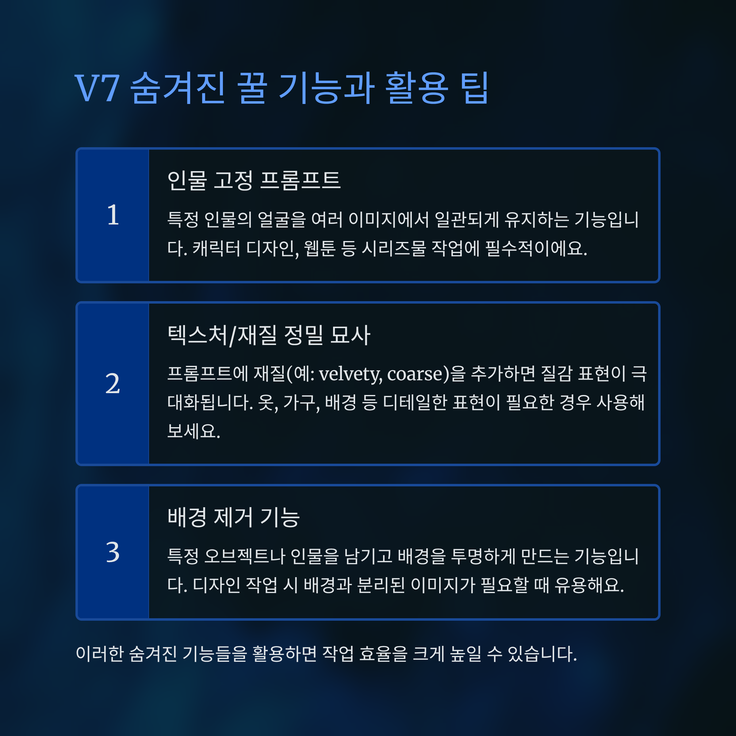 미드저니 V7에는 공식적으로 언급되지 않았지만, 사용자들이 직접 찾아낸 숨겨진 꿀 기능들이 있습니다. 이 기능들을 잘 활용하면 작업 효율을 크게 높일 수 있습니다. 가장 유용한 세 가지를 알려드릴게요.