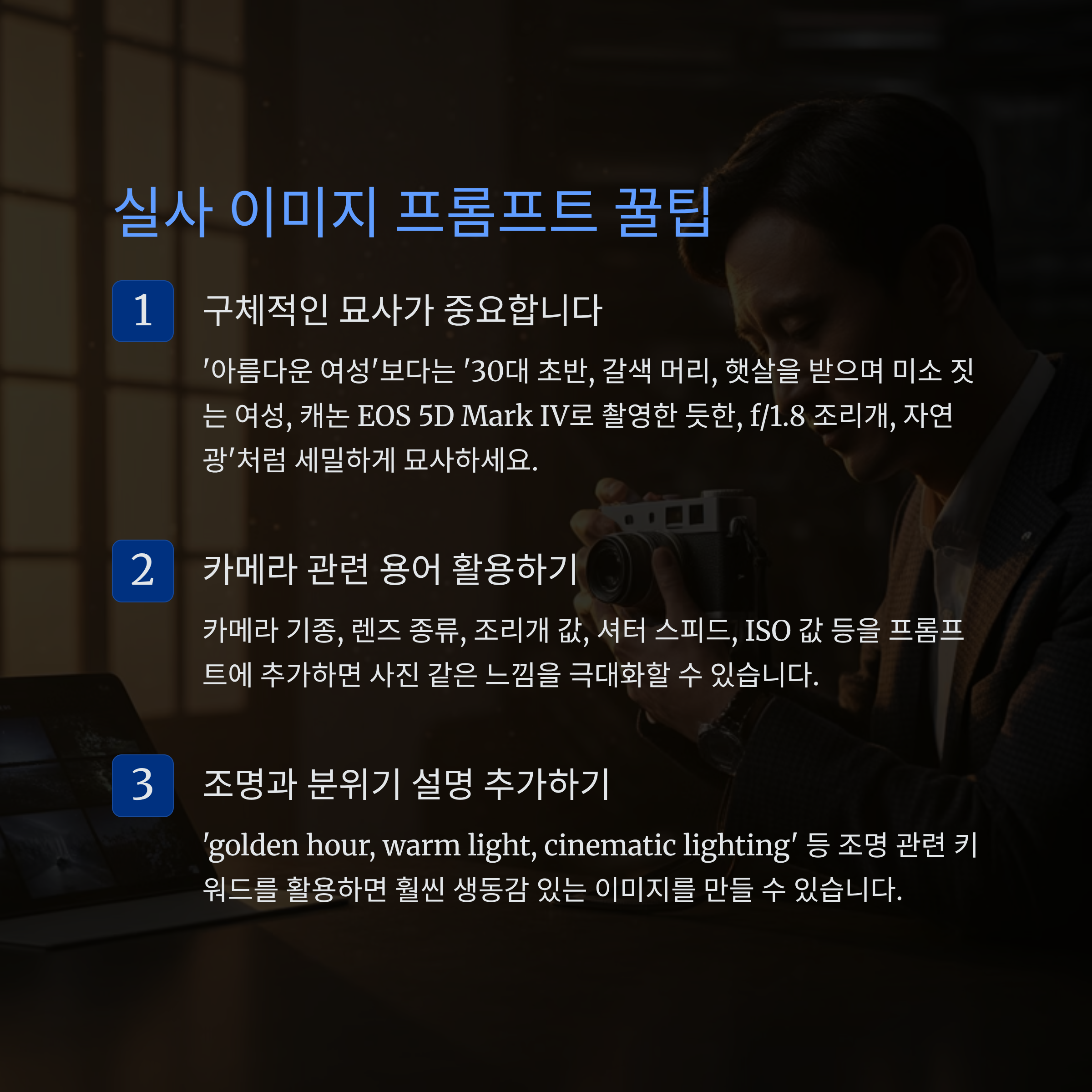 첫 번째, 실사 표현력은 이전 버전과는 비교할 수 없을 정도로 놀랍게 발전했어요. 인물 피부의 질감, 머리카락 한 올, 심지어 빛과 그림자의 미묘한 변화까지 정교하게 표현해 냅니다.