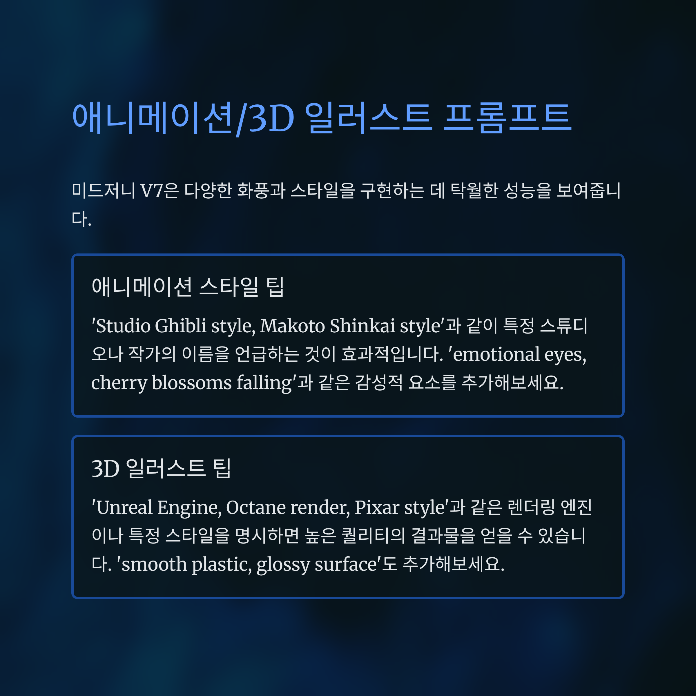 미드저니 V7은 실사뿐만 아니라 애니메이션과 3D 일러스트 생성 능력도 매우 뛰어납니다. 특히 다양한 화풍과 스타일을 구현하는 데 탁월한 성능을 보여줍니다.