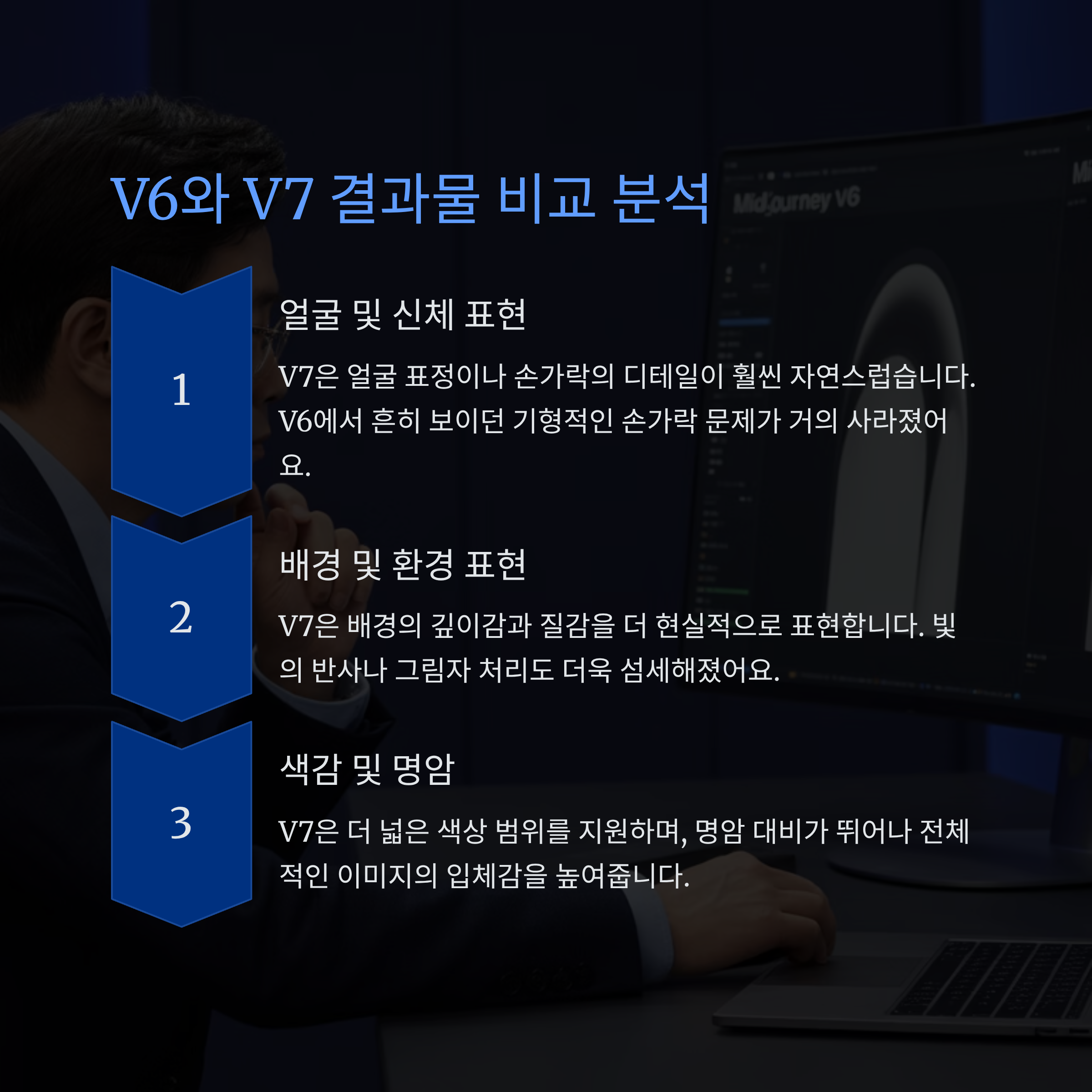 가장 큰 차이점은 '디테일'과 '자연스러움'에 있습니다. V6는 전반적인 분위기를 잘 잡아주지만, 세부적인 묘사에서 가끔 어색한 부분을 보이곤 했어요.