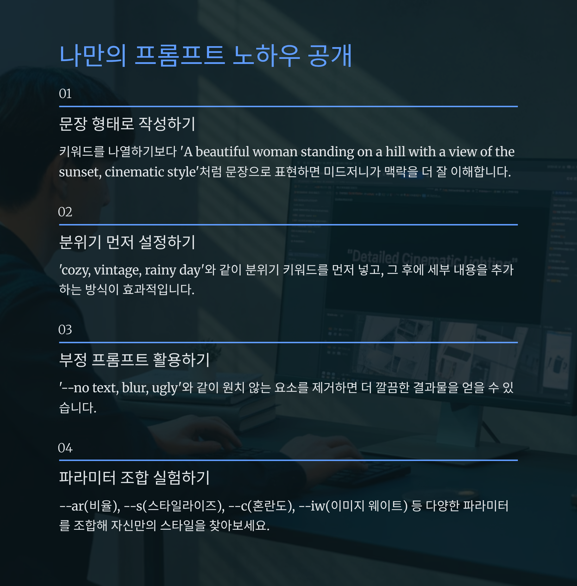 미드저니를 오래 사용하며 제가 터득한 몇 가지 노하우를 공유할게요.