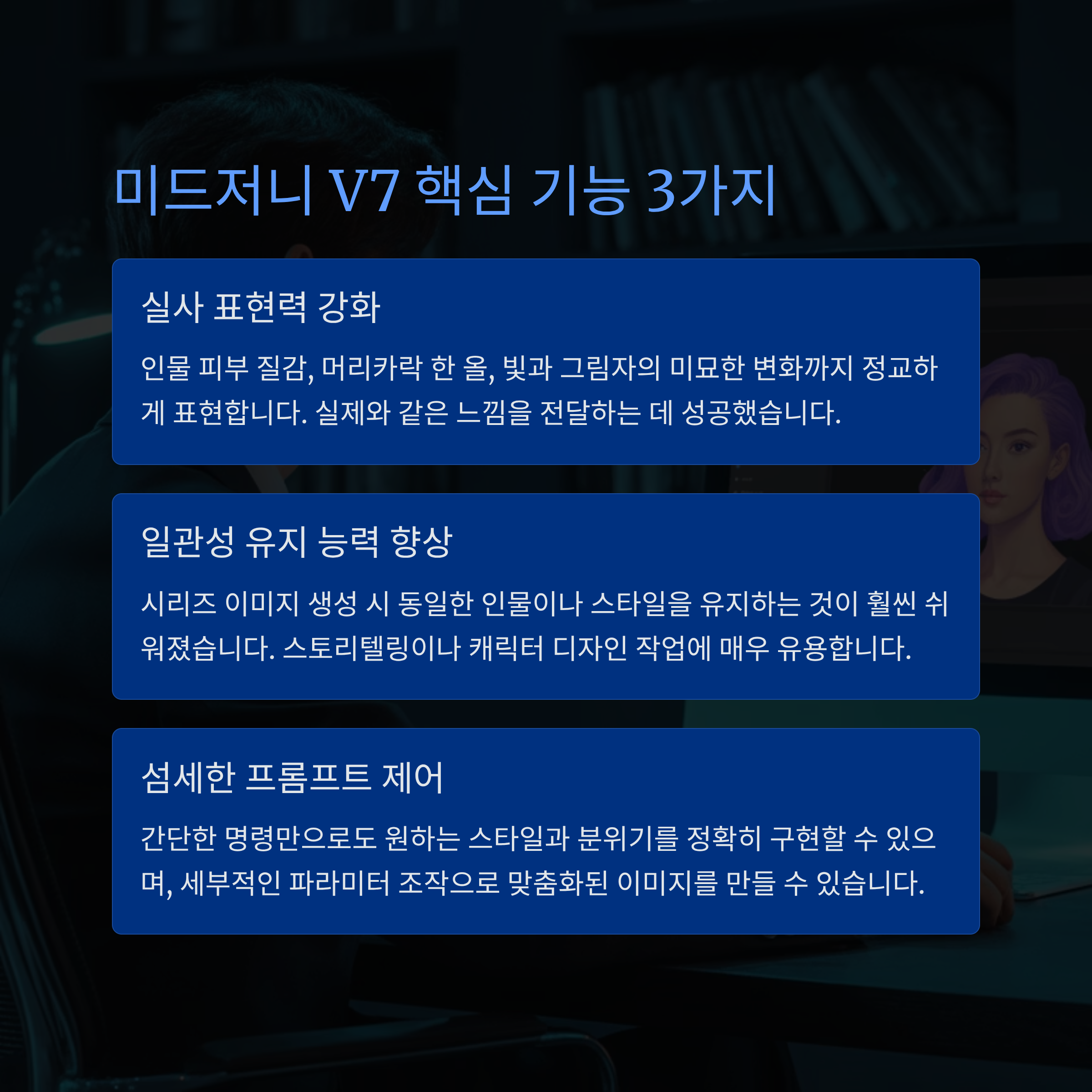 미드저니 최신 버전 업데이트를 직접 경험하며 느낀 솔직한 후기를 남겨봅니다. 결론부터 말하자면, V7은 이미지 생성 AI의 새로운 기준을 제시했다고 해도 과언이 아닙니다.
