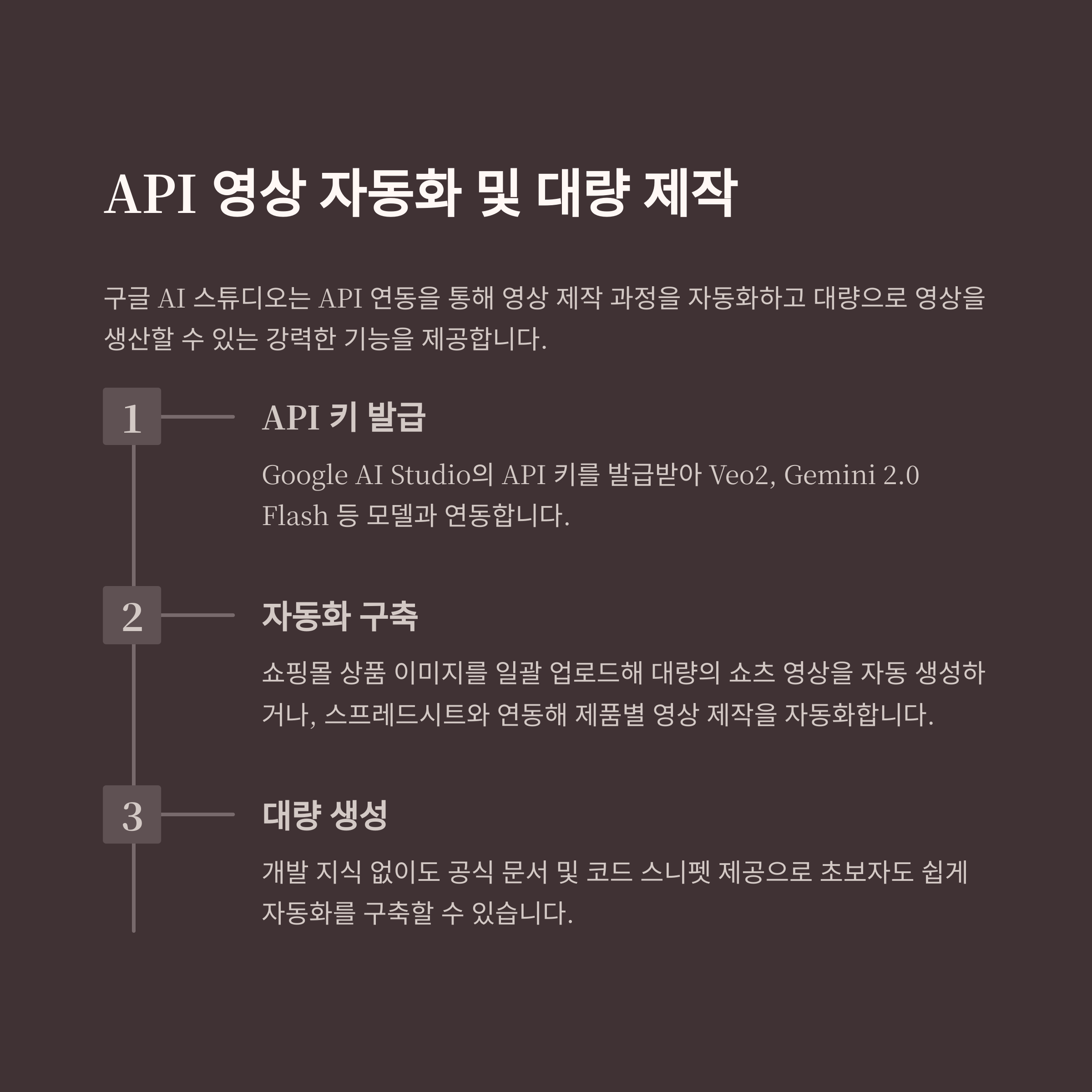 구글 AI 스튜디오는 API 연동을 통해 영상 제작 과정을 자동화하고 대량으로 영상을 생산할 수 있는 강력한 기능을 제공합니다.