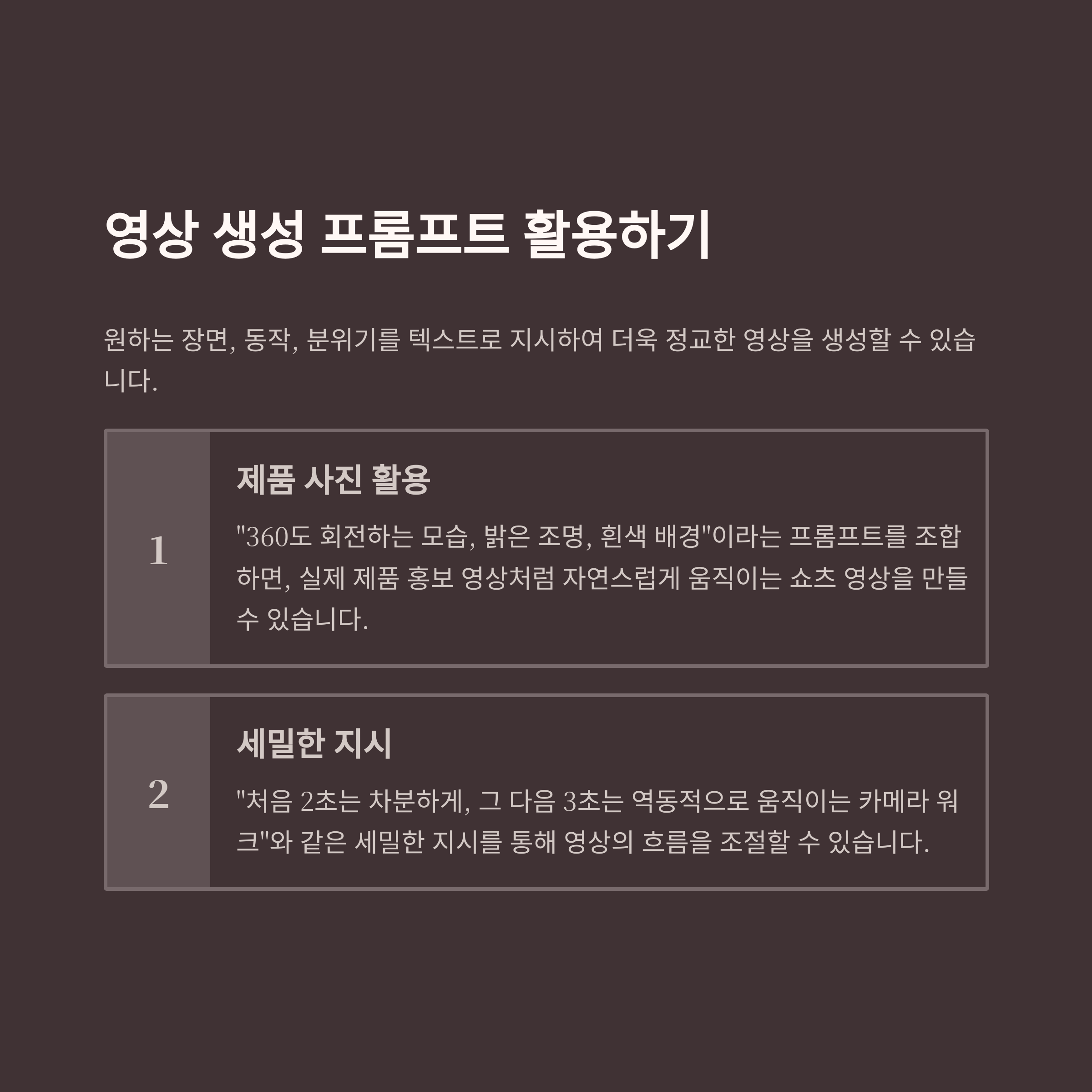 - 영상 생성 프롬프트: 원하는 장면, 동작, 분위기를 텍스트로 지시하여 영상 생성.