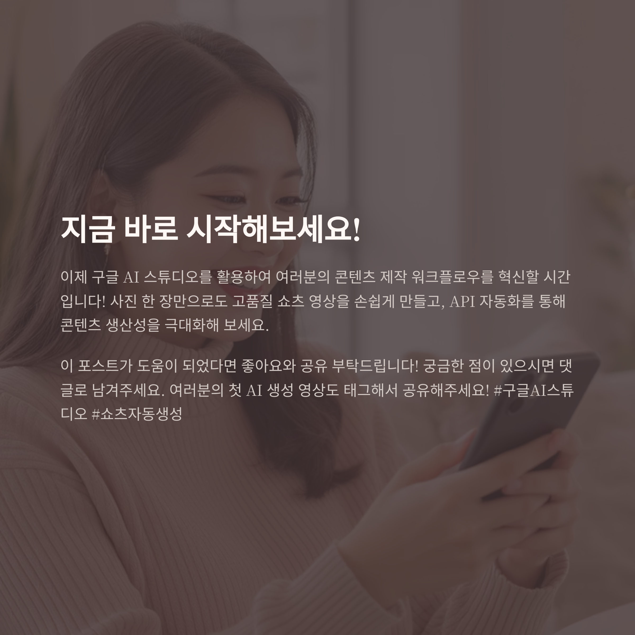 이제 구글 AI 스튜디오를 활용하여 여러분의 콘텐츠 제작 워크플로우를 혁신할 시간입니다! 사진 한 장만으로도 고품질 쇼츠 영상을 손쉽게 만들고, API 자동화를 통해 콘텐츠 생산성을 극대화해 보세요. 궁금한 점이 있다면 언제든지 댓글로 남겨주세요!