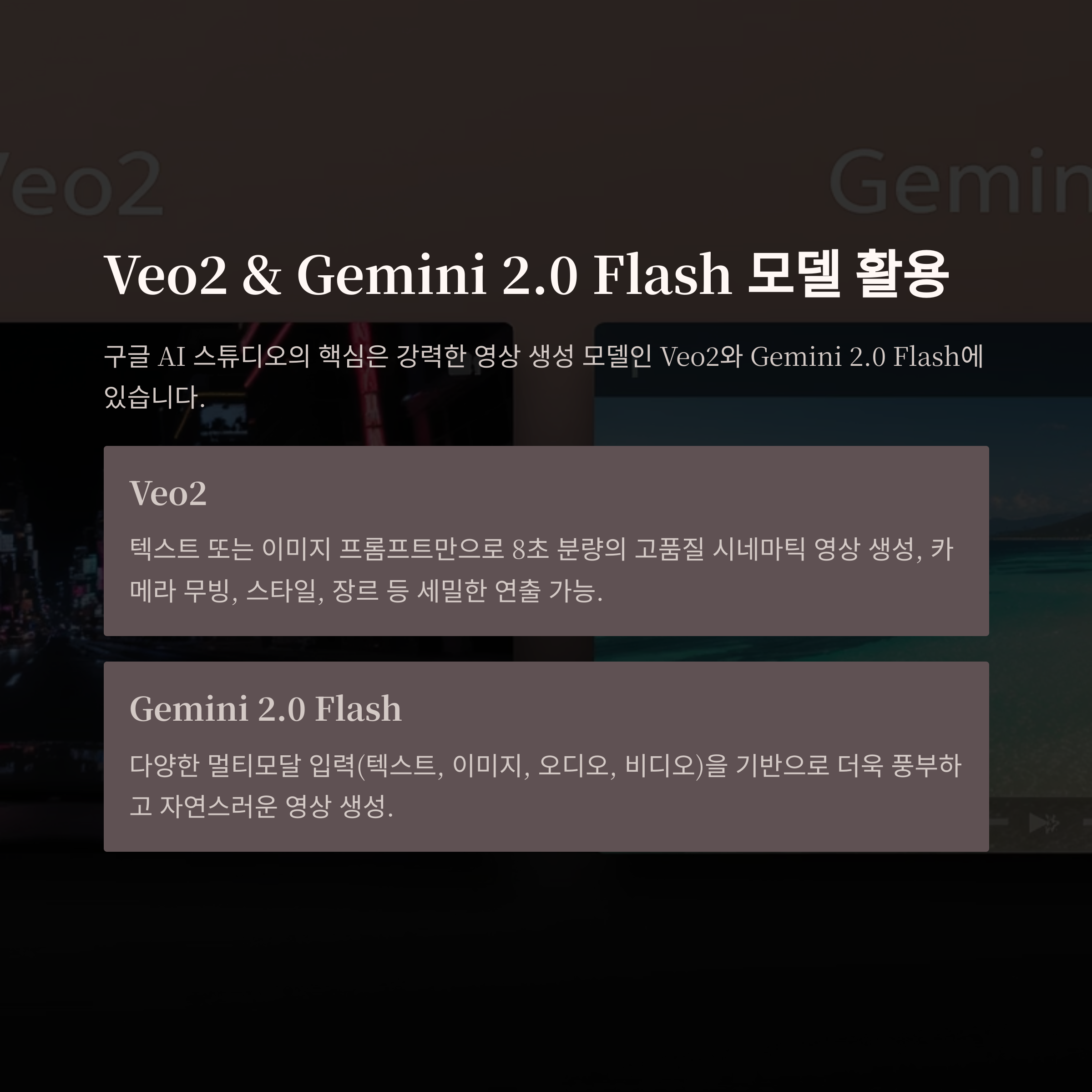 구글 AI 스튜디오의 핵심은 강력한 영상 생성 모델인 Veo2와 Gemini 2.0 Flash에 있습니다.