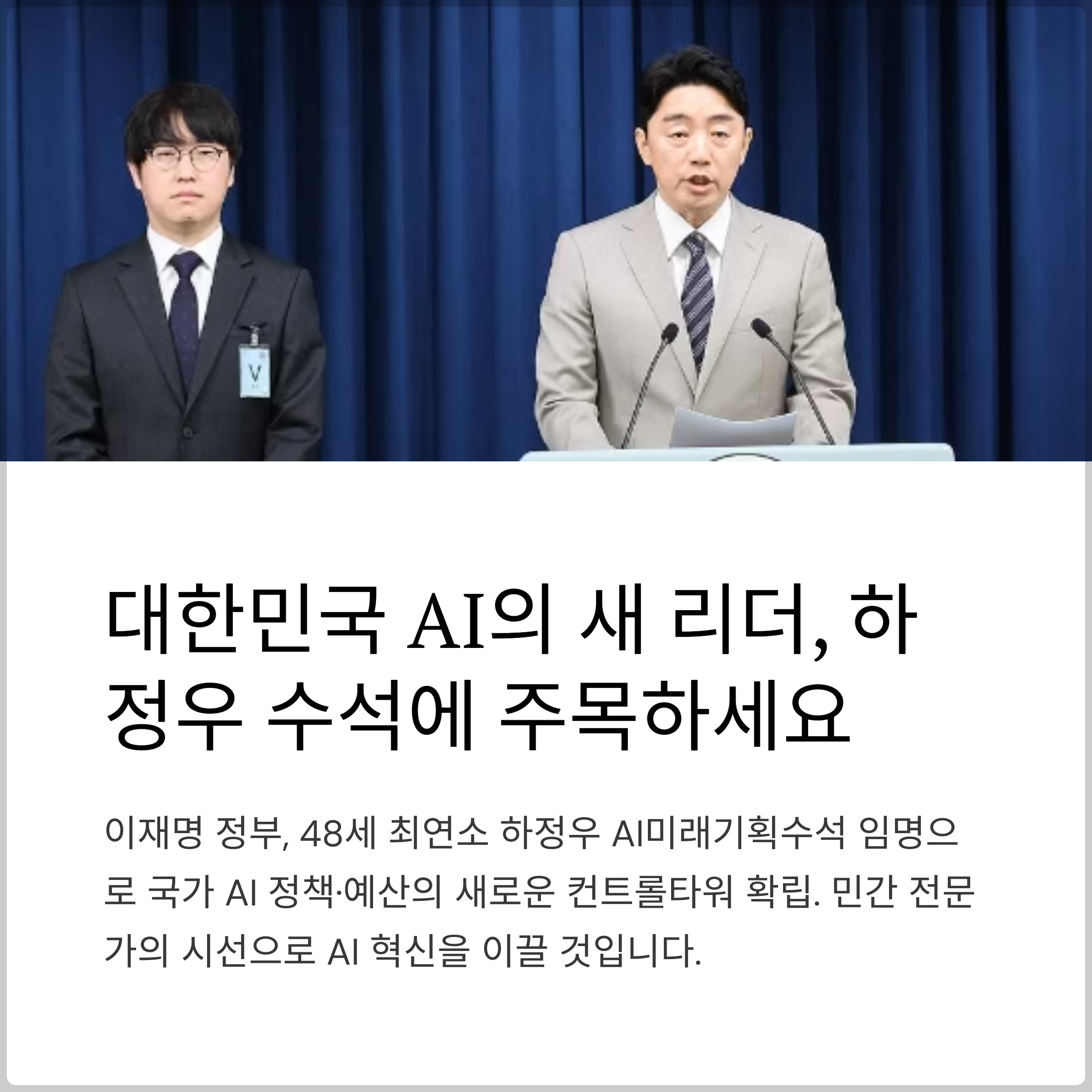 IT와 미래 기술에 관심 많은 여러분! 최근 새 정부의 AI미래기획수석으로 네이버클라우드 AI이노베이션센터장 하정우 님이 임명되면서 큰 화제가 되고 있습니다. 국내외 AI 생태계에서 독보적인 실무 경험과 연구 성과를 쌓아온 그가 대한민국 AI 정책의 컨트롤타워를 맡게 되면서 많은 이들의 기대가 모이고 있는데요. 오늘은 하정우 AI수석에게 거는 기대와 그가 만들어갈 AI 혁신의 미래에 대해 자세히 알아보겠습니다.