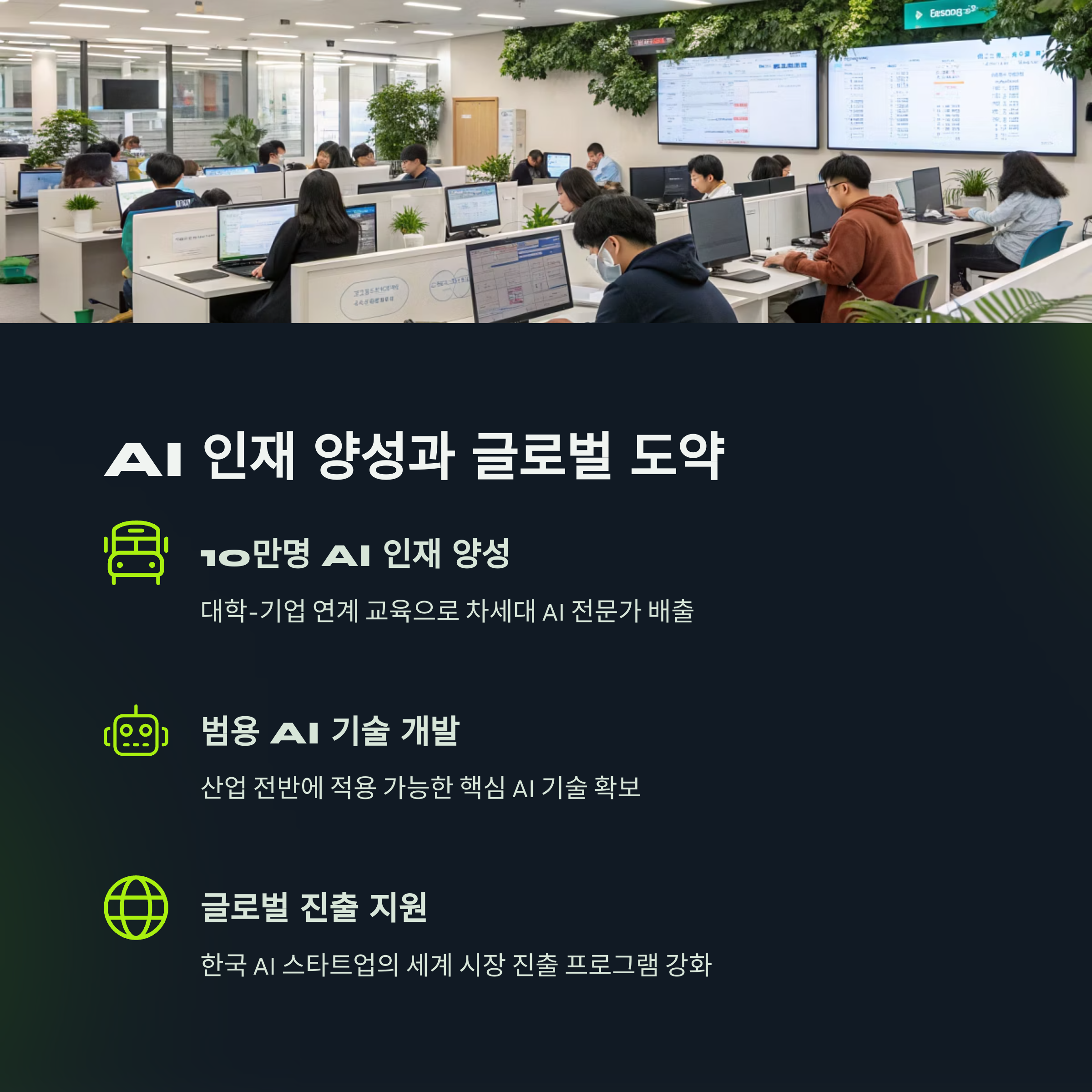 - 투자 및 인프라 확대: 100조 원 규모 투자, AI 인재 양성