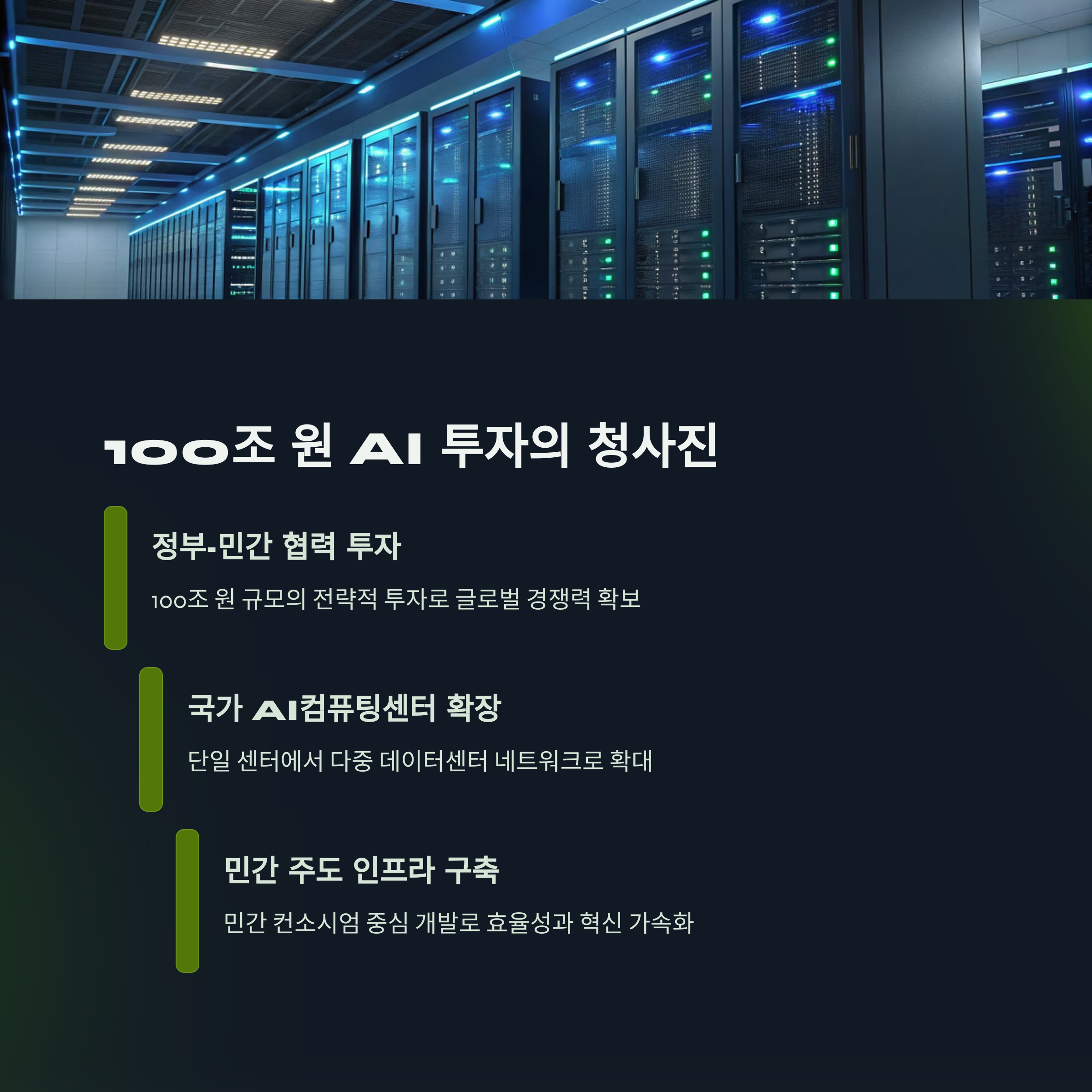 정부와 민간이 공동으로 100조 원 규모의 펀드를 조성하여 AI 산업 생태계를 육성합니다. 특히 GPU 1만 5,000장 규모의 국가 AI컴퓨팅센터 건설과 울산에 6만 장 규모의 민간 데이터센터 구축이 추진되고 있습니다.