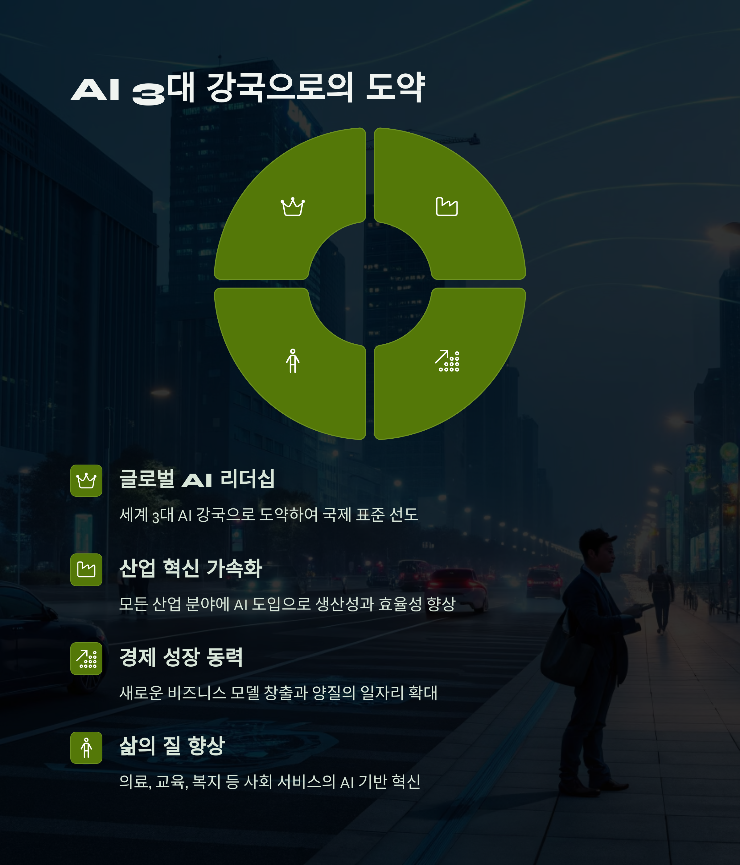 - 투자 및 인프라 확대: 100조 원 규모 투자, AI 인재 양성
