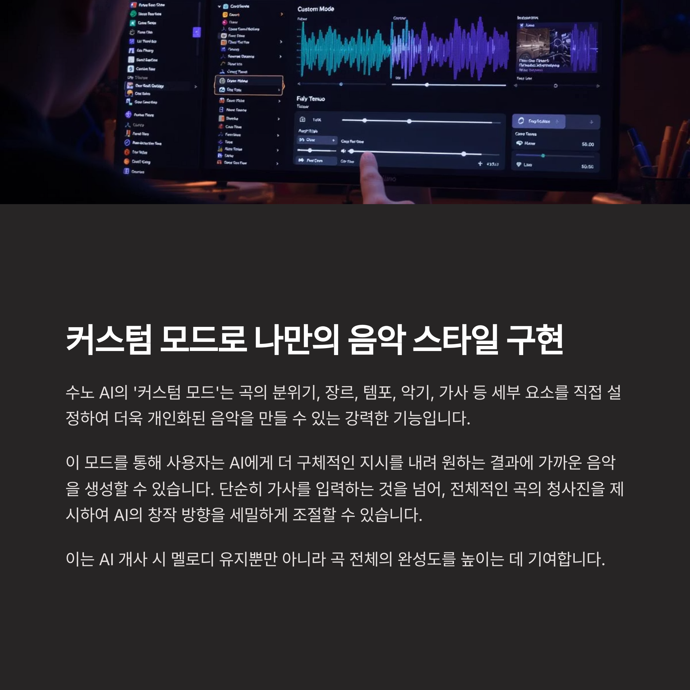 수노 AI의 '커스텀 모드'는 곡의 분위기, 장르, 템포, 악기, 가사 등 세부 요소를 직접 설정하여 더욱 개인화된 음악을 만들 수 있는 강력한 기능입니다. 이 모드를 통해 사용자는 AI에게 더 구체적인 지시를 내려 원하는 결과에 가까운 음악을 생성할 수 있습니다.