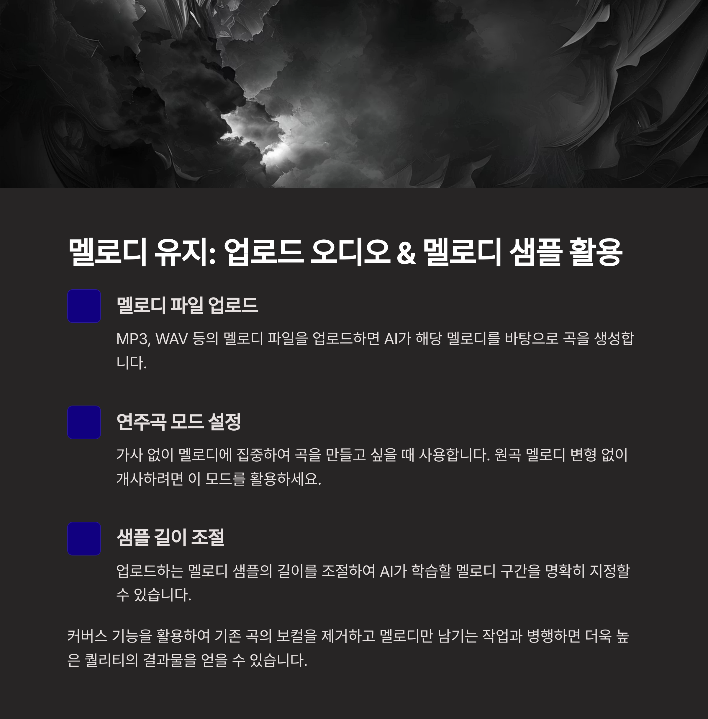 | 샘플 길이 조절 | 업로드하는 멜로디 샘플의 길이를 조절하여 AI가 학습할 멜로디 구간을 명확히 지정할 수 있습니다. |