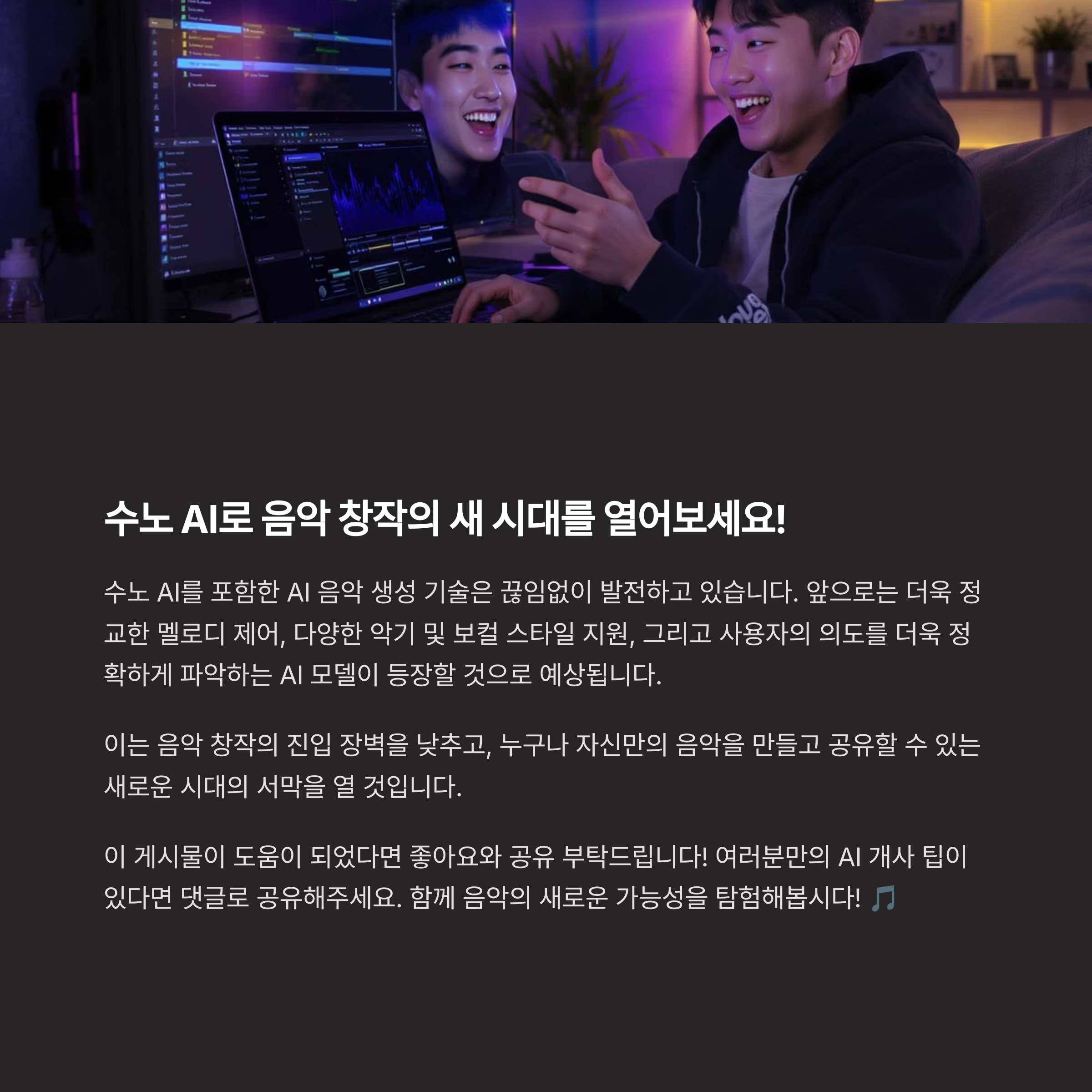 이는 음악 창작의 진입 장벽을 낮추고, 누구나 자신만의 음악을 만들고 공유할 수 있는 새로운 시대의 서막을 열 것입니다.